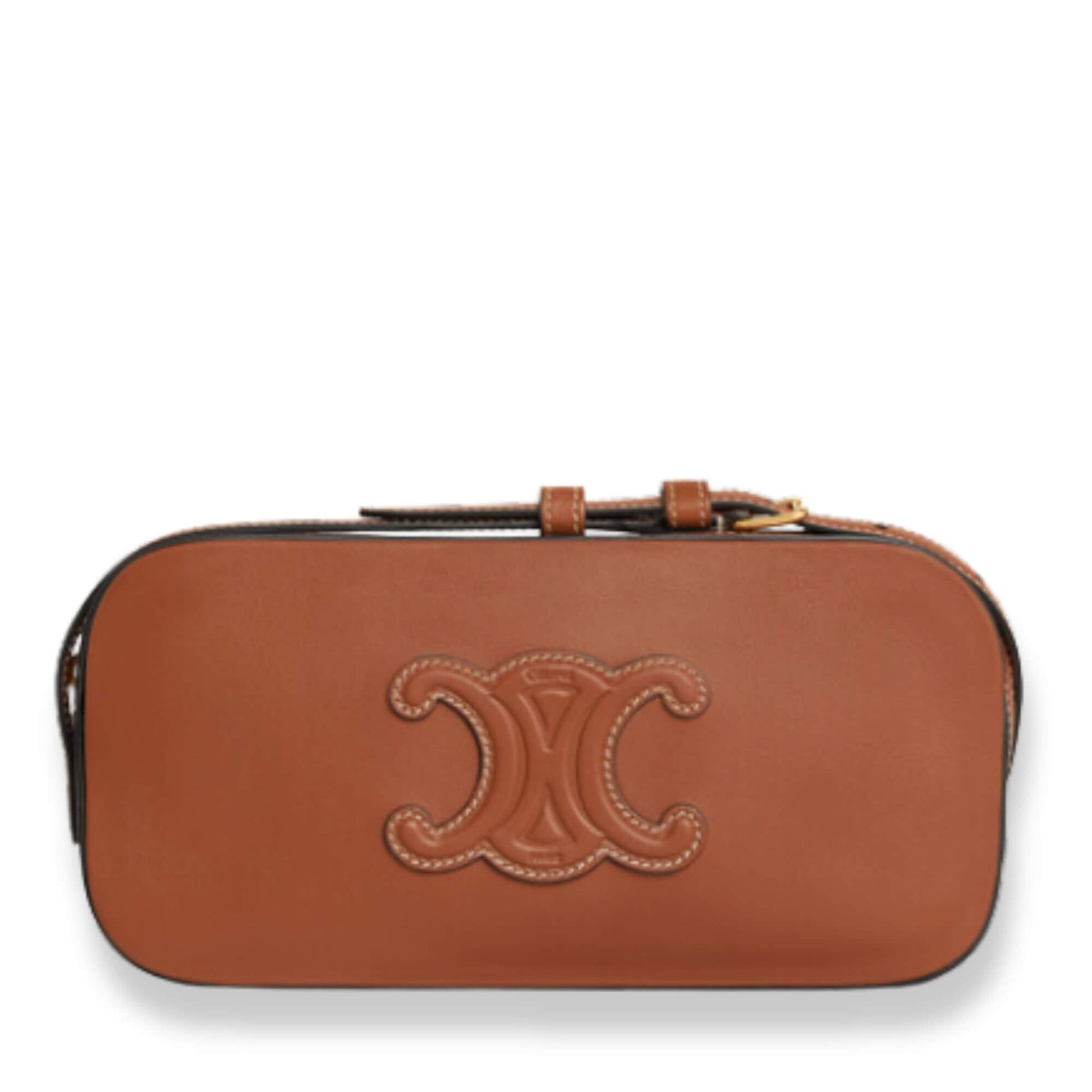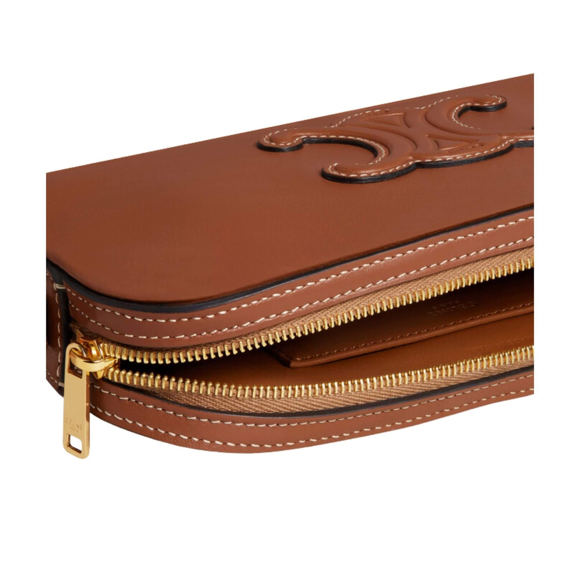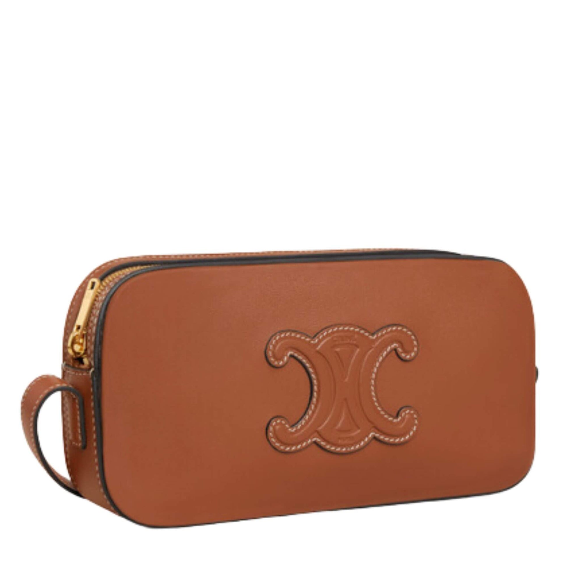 Este NUEVO bolso Celine está elaborado en suave piel de becerro con forro de piel de becerro beige. Luce el icono del triunfo bordado en la parte delantera. Todos los detalles tienen un acabado dorado. Cuenta con una correa larga para el hombro.