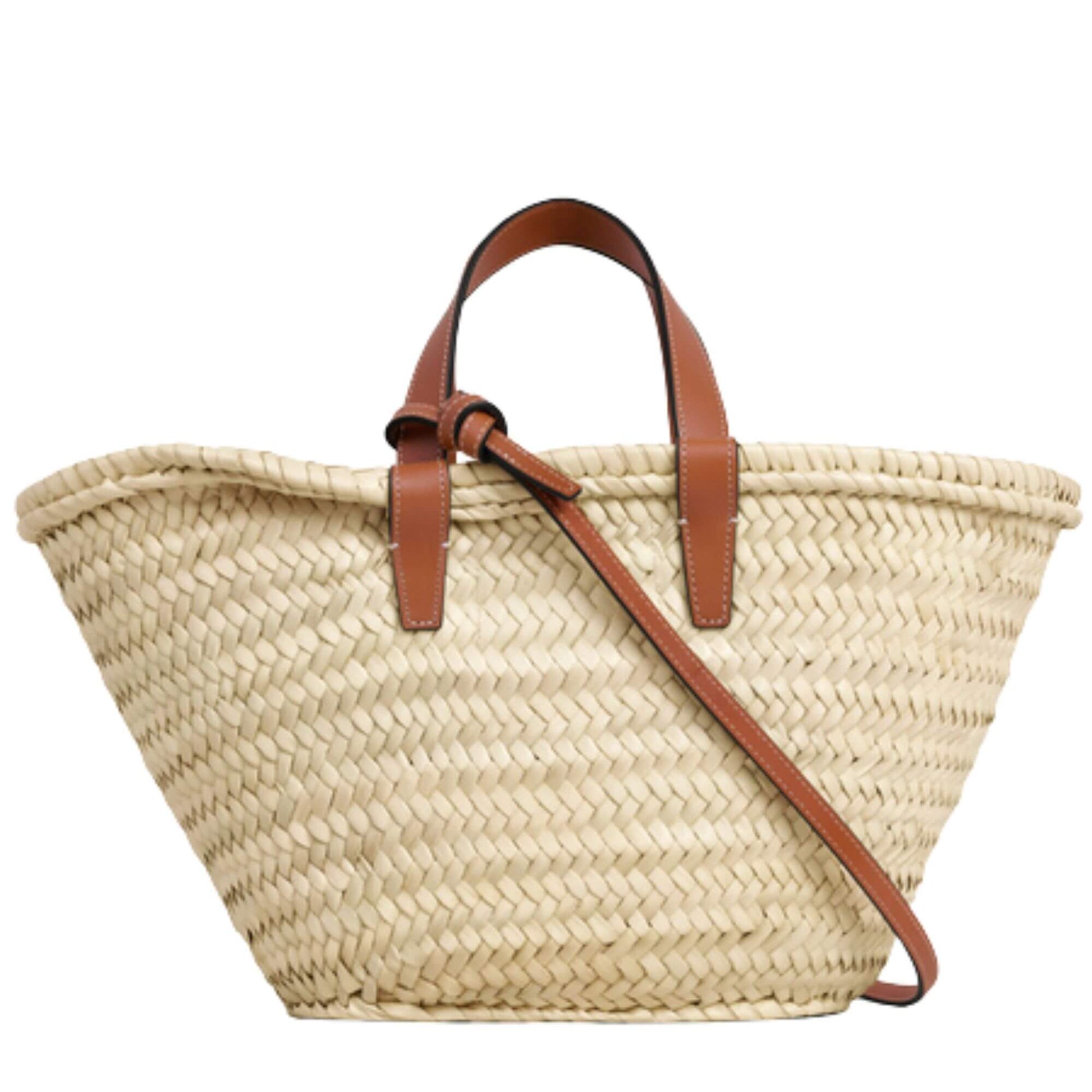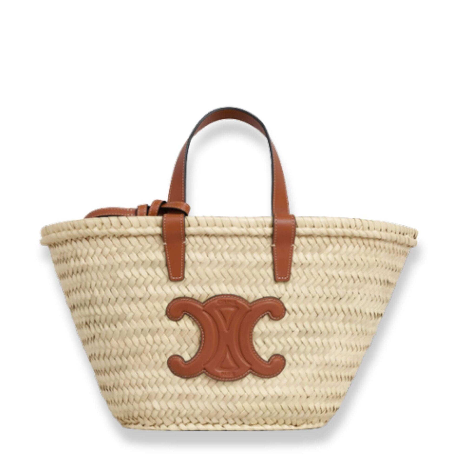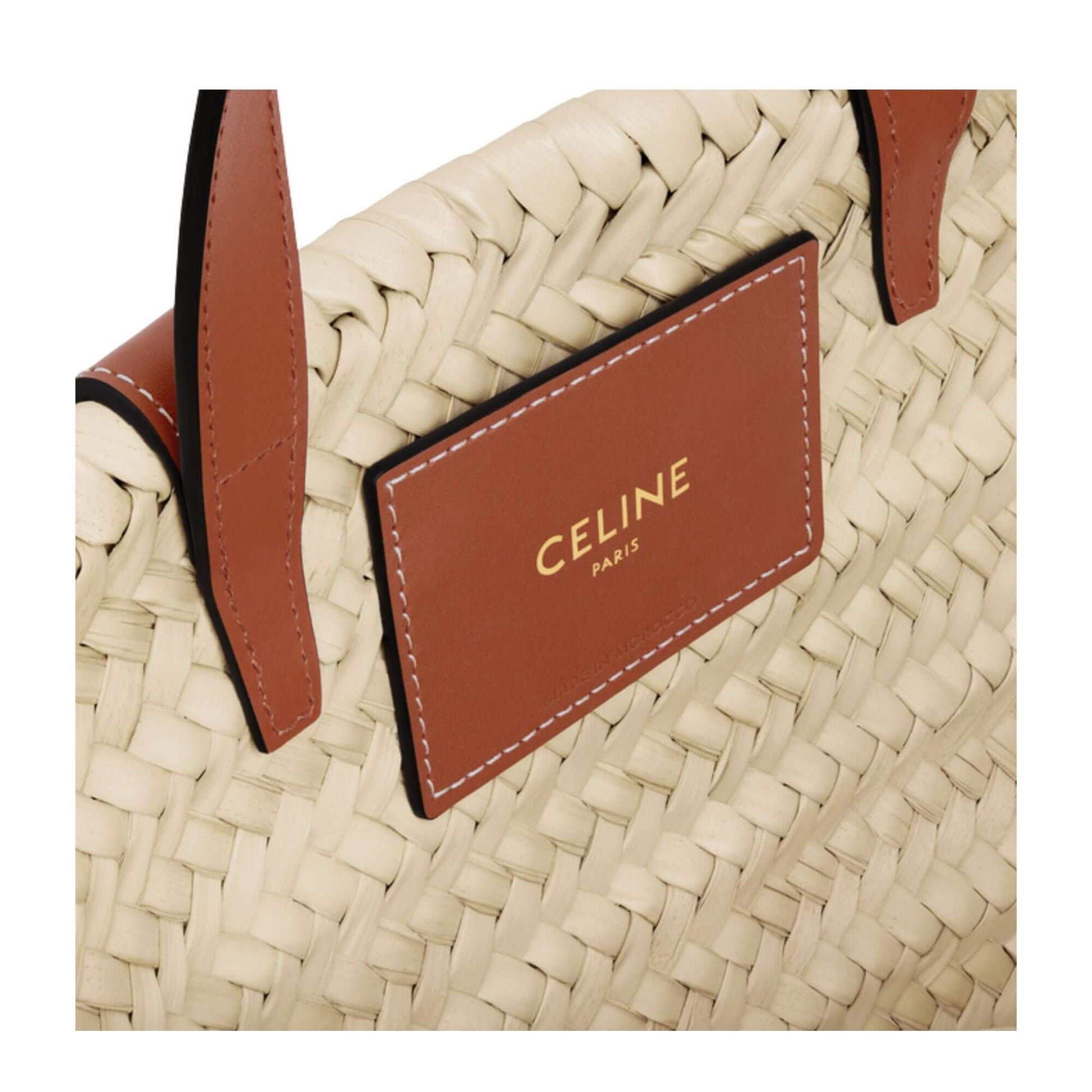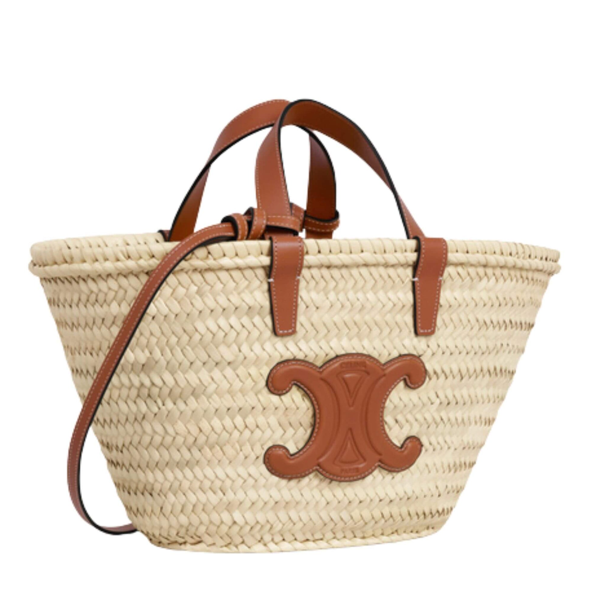 Este nuevo bolso Celine Basket está hecho a mano con hojas de palma y ribetes de piel de becerro en tonos tostados. Se puede llevar en la mano y al hombro. Las asas y el detalle del triunfo frontal son de piel marrón y tiene un acabado dorado.