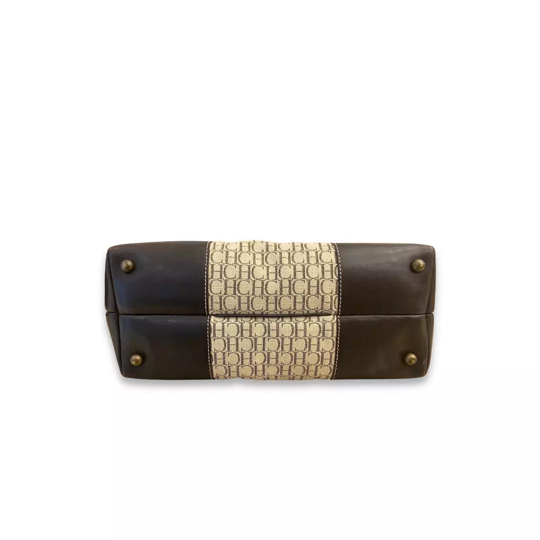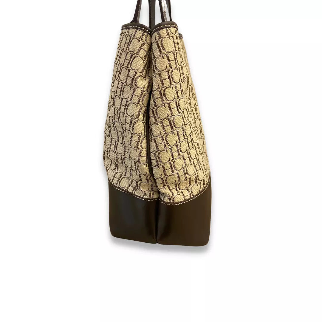 Este bolso tote de lona con monograma de Carolina Herrera usado en color beige y detalles de cuero marrón está en muy buenas condiciones.