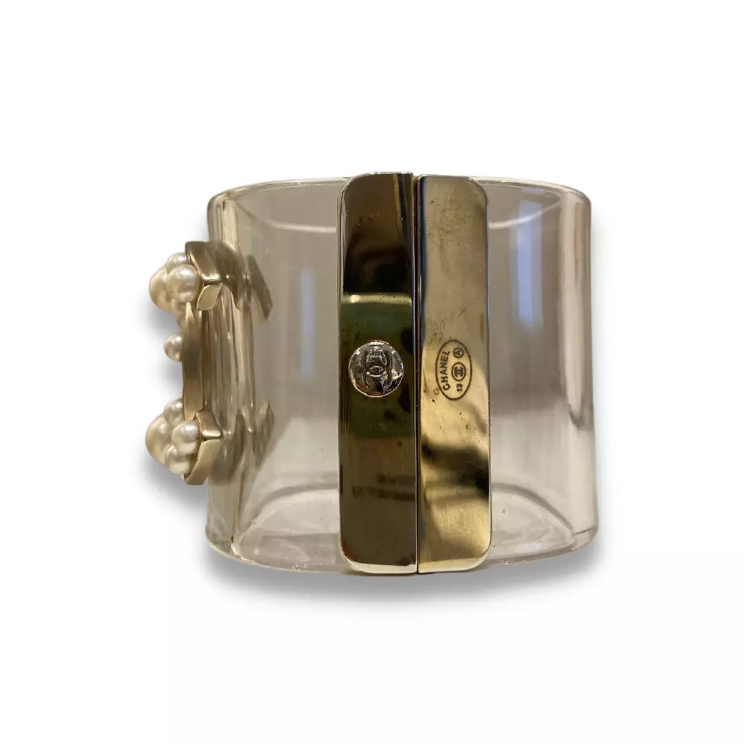 Esta pulsera ancha Chanel de resina transparente y perlas CC usada, con el icónico logotipo de Chanel de 5 cm de ancho, está en buenas condiciones.