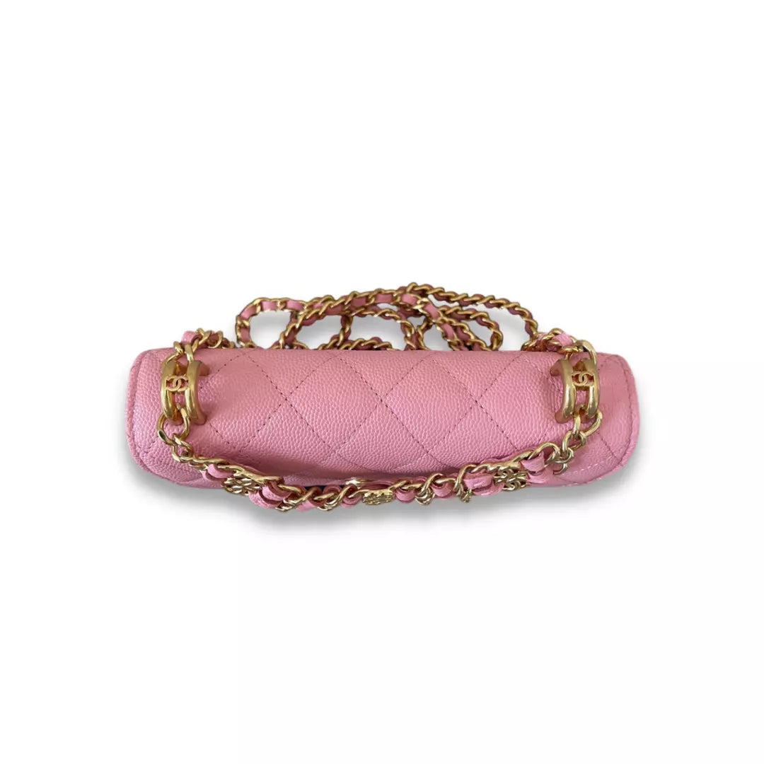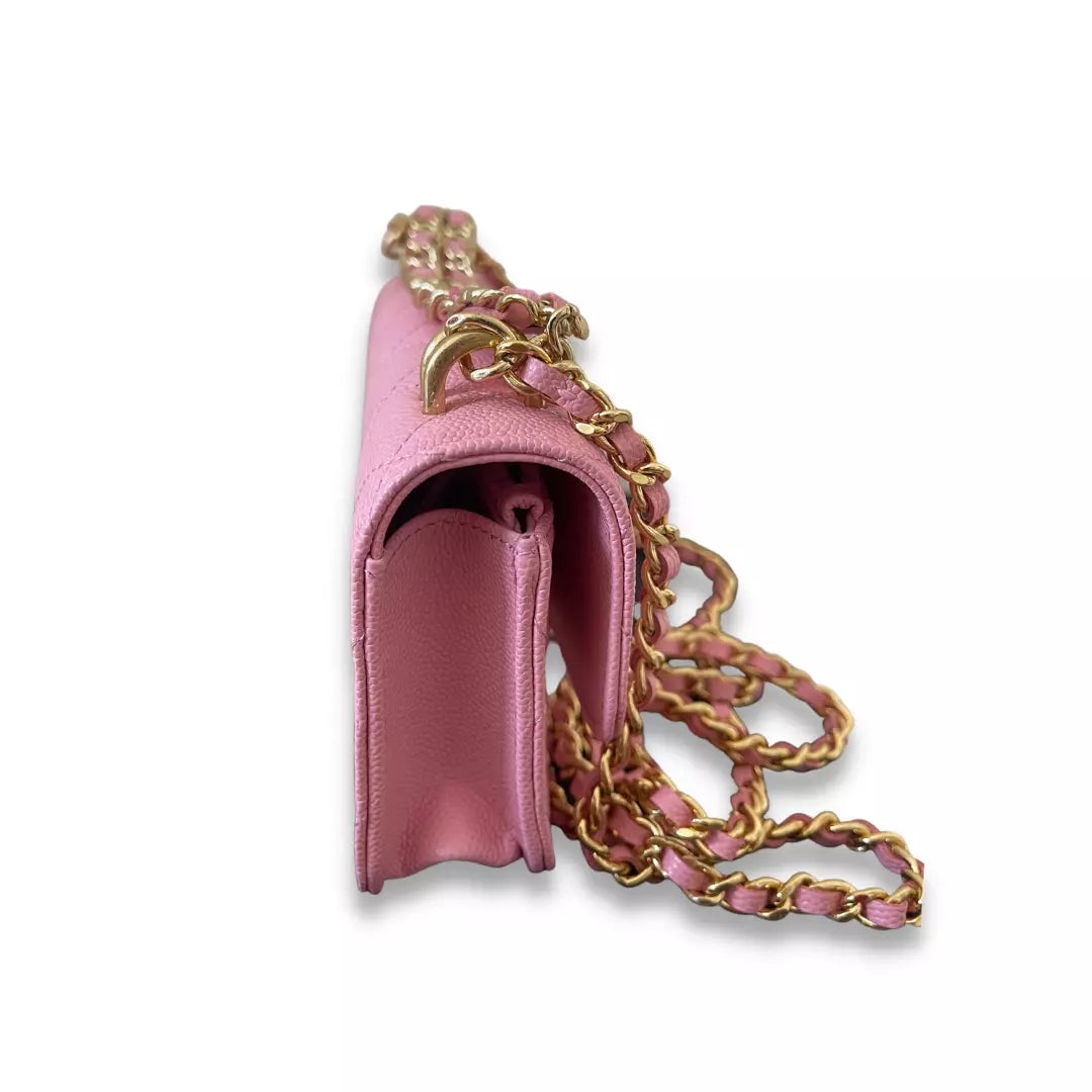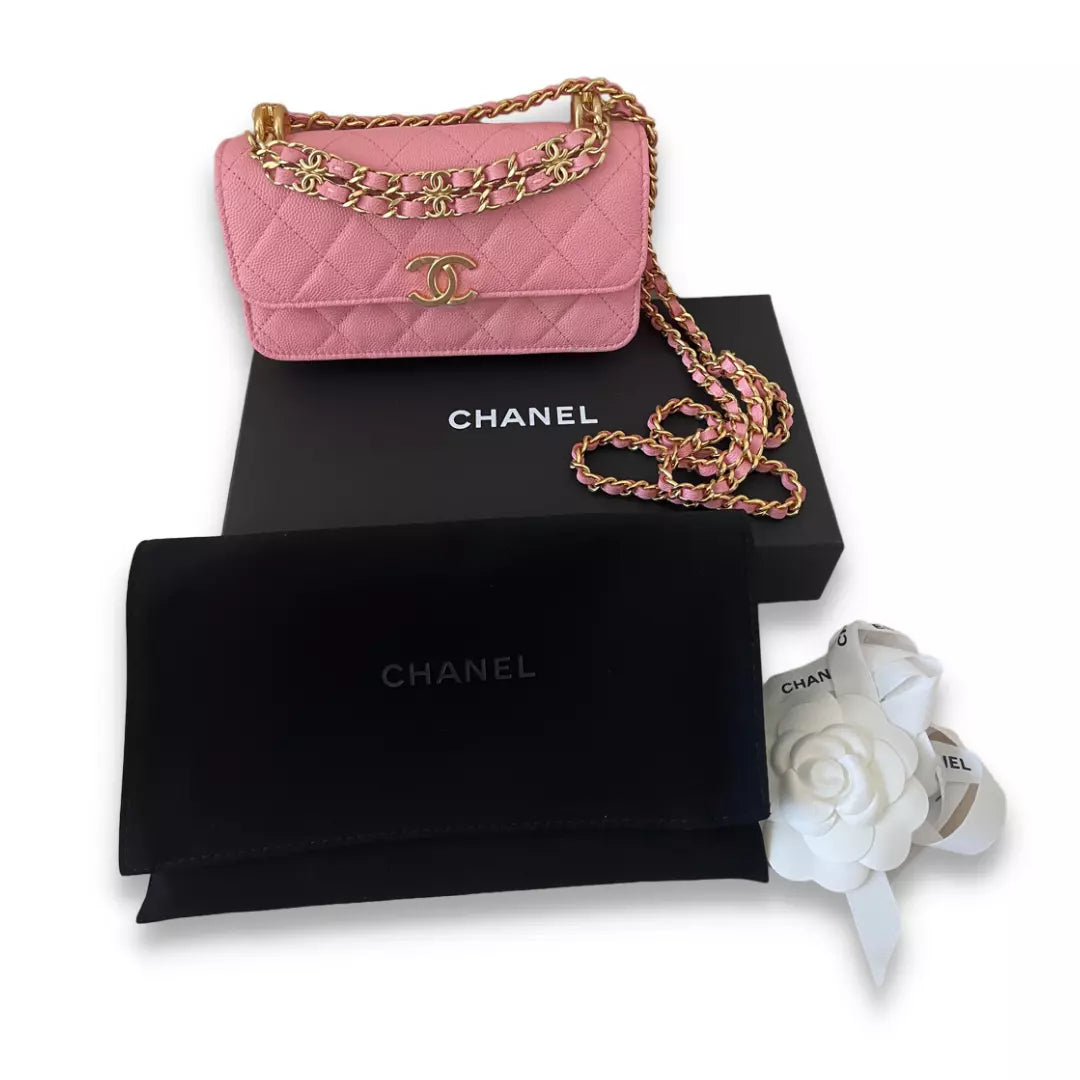 Bolso Chanel rosa con cadena, completamente nuevo, fabricado en clásica piel caviar. Este bolso es una pieza muy especial gracias a su doble cadena: la clásica para el hombro y la delantera. Año de compra: 2022. WOC es un bolso bandolera con solapa, perfecto para looks sofisticados de diario.