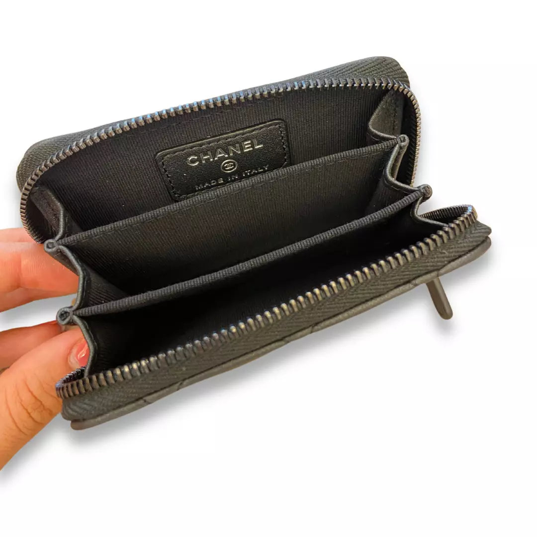 Nuevo tarjetero Chanel Black So Black, edición limitada, con piel de becerro granulada y logotipo metálico negro de Chanel, con tres compartimentos. En perfecto estado. Agotado en todas partes; una auténtica pieza de coleccionista.