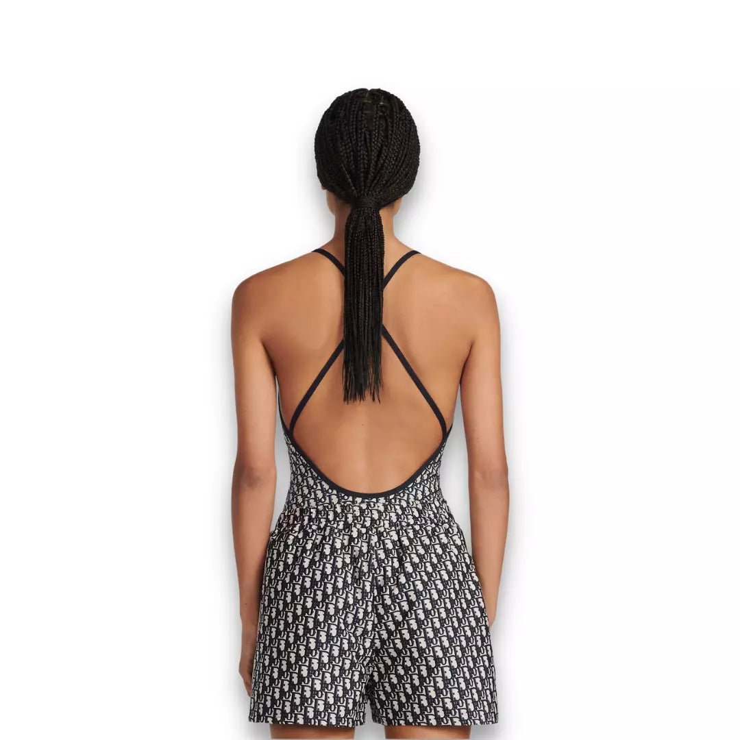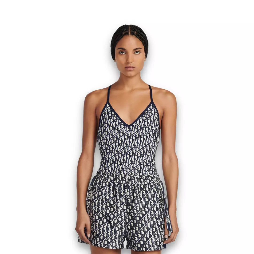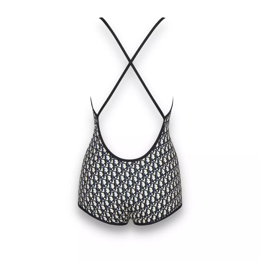 Este bañador Dior de segunda mano con motivo oblicuo. Confeccionado en tejido técnico azul, presenta escote en V y tirantes cruzados en la espalda. Una abeja bordada, un emblema muy apreciado de Dior, adorna la pieza.