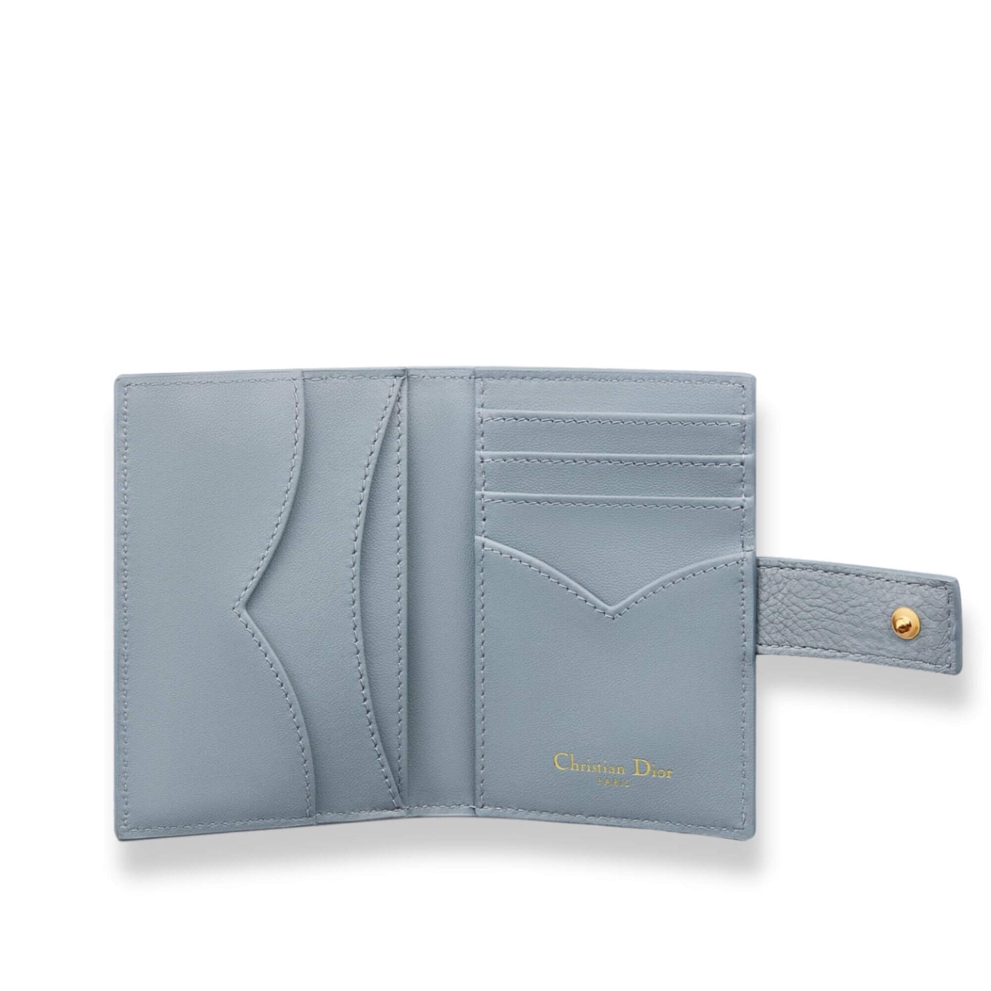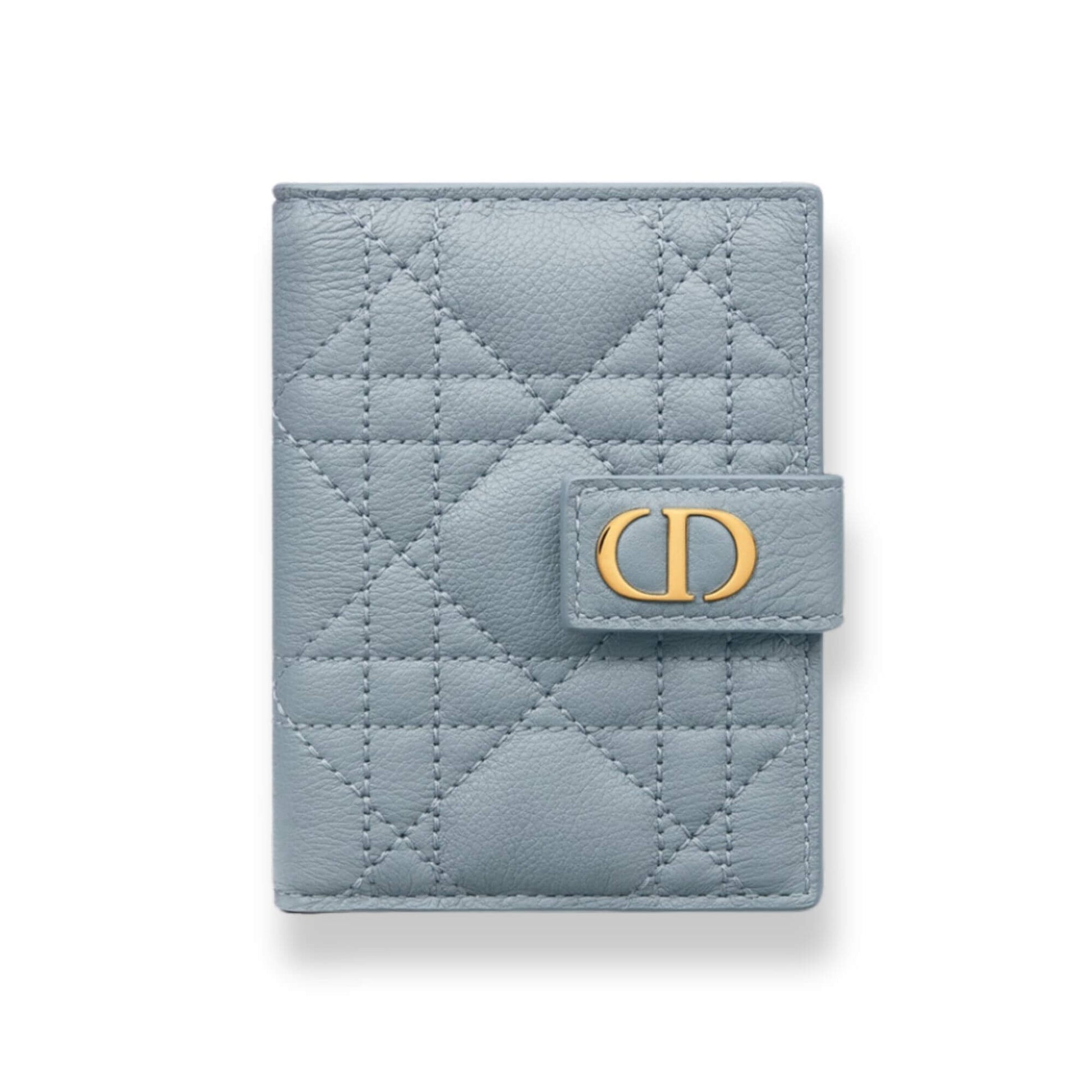 Esta NUEVA cartera Dior es vertical, confeccionada en piel de becerro en Azul Nube Cannage con diseño acolchado. Tiene una solapa horizontal, seis ranuras para tarjetas en el interior y un detalle con el logotipo de Dior en la parte frontal, hecho con herrajes dorados.