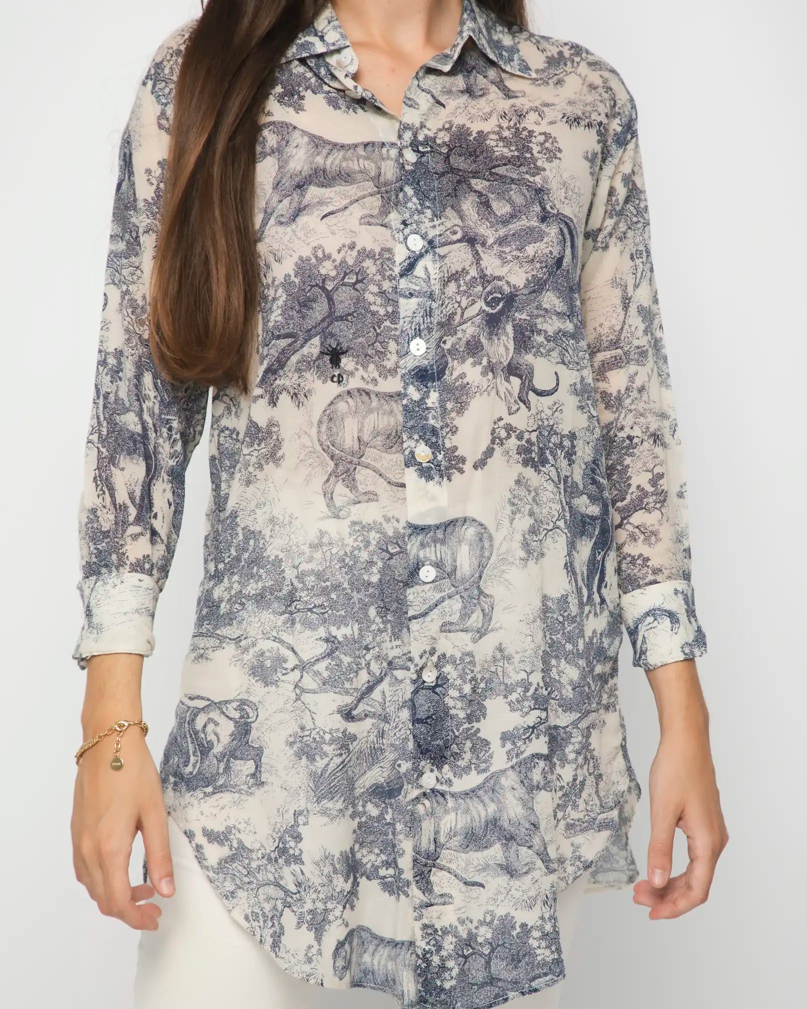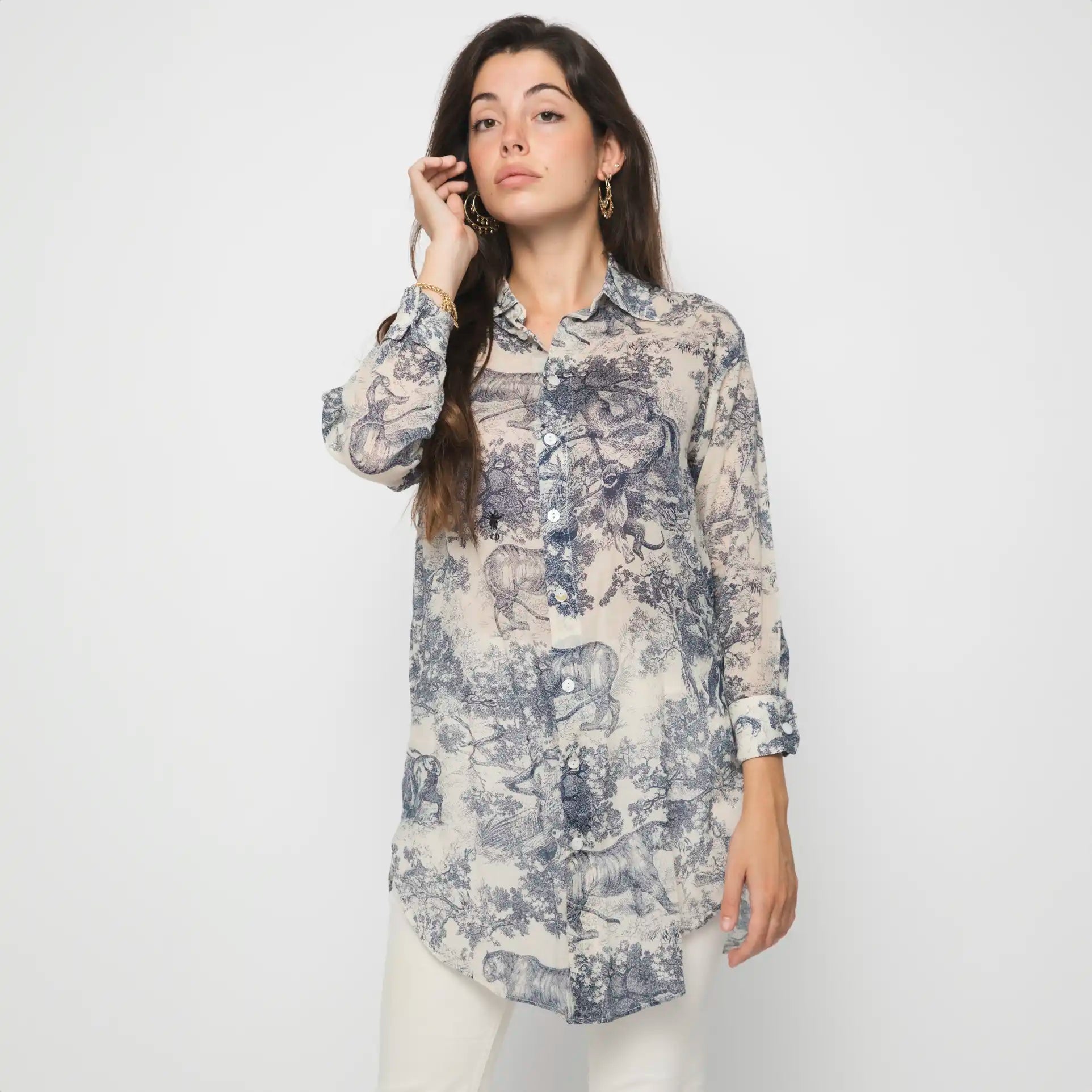 Camisa larga Dior Riviera de segunda mano . Con una silueta icónica de Dior, esta blusa luce el icónico motivo Toile de Jouy. Está confeccionada en voile de algodón blanco y se cierra con botones en la parte delantera.