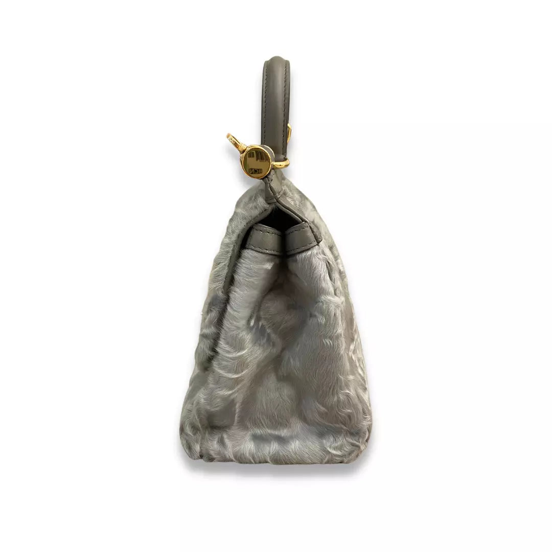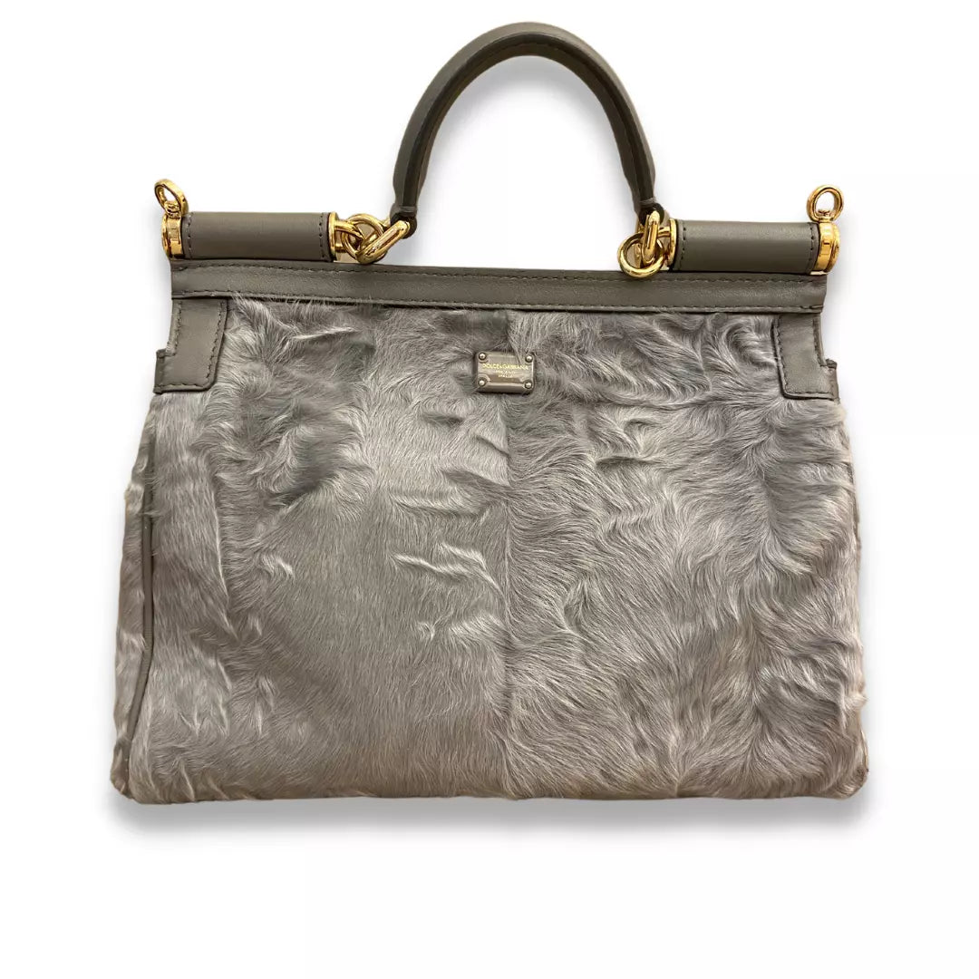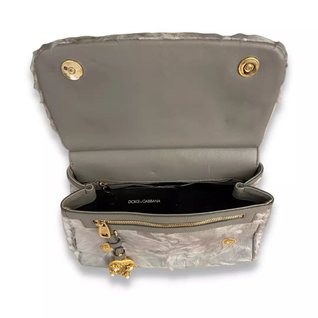 Este bolso Sicilia de astracán gris de Dolce & Gabbana usado, con herrajes dorados, se encuentra en muy buenas condiciones. Viene con una cadena cruzada larga extraíble y un espejo de cortesía en el interior del bolso.