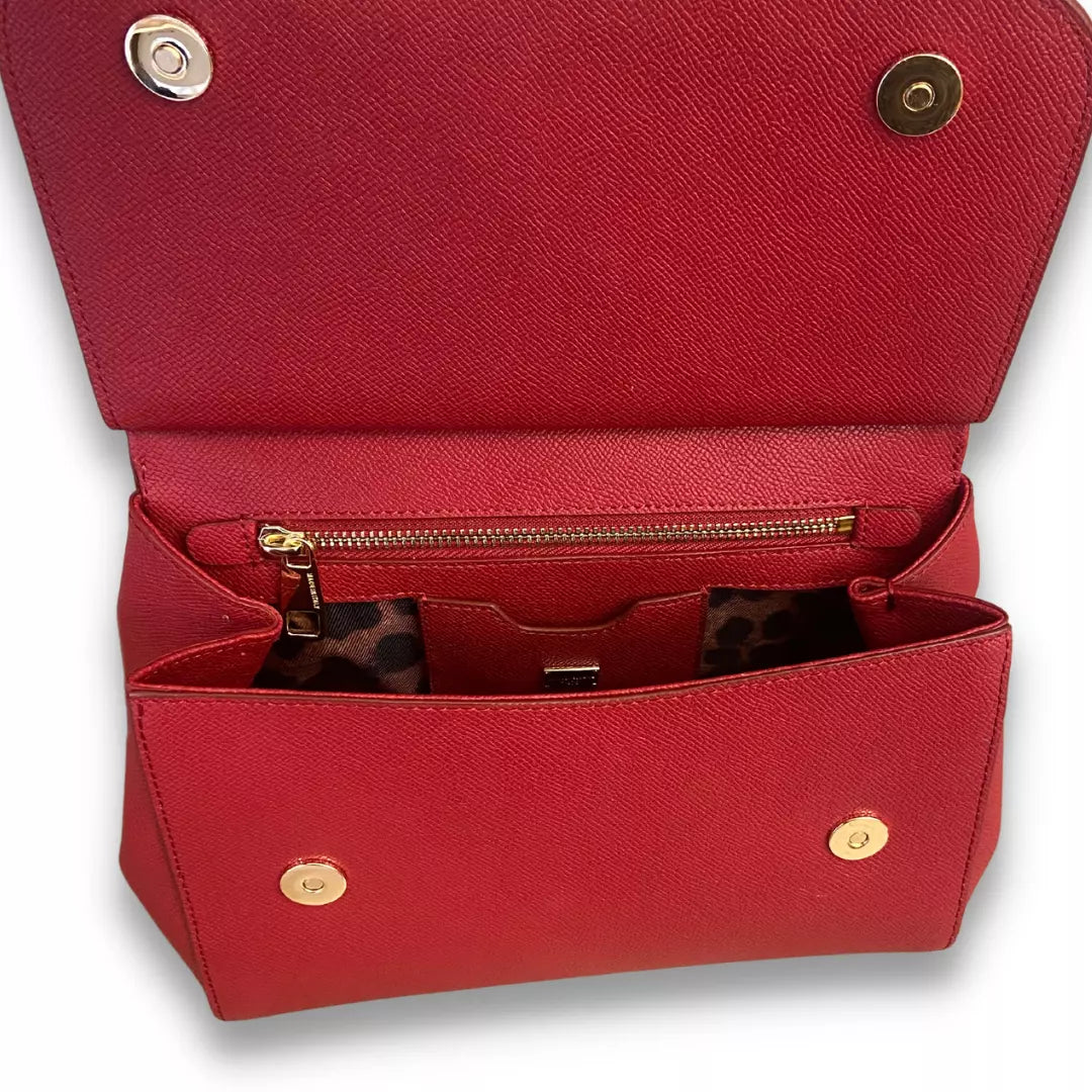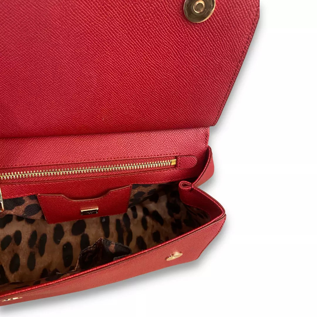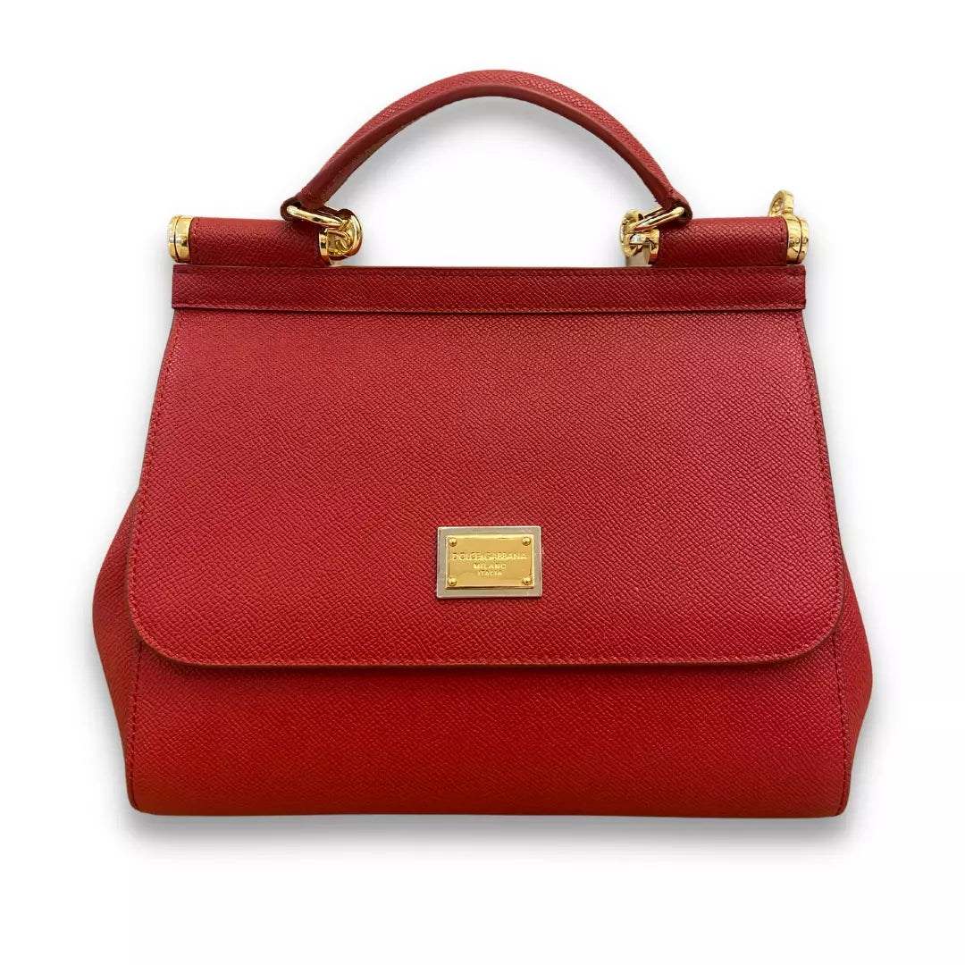 Este bolso de mano Sicily de cuero rojo de Dolce & Gabbana usado, con herrajes dorados, se encuentra en muy buenas condiciones. Viene con una cadena cruzada larga extraíble y un espejo de cortesía en el interior del bolso.