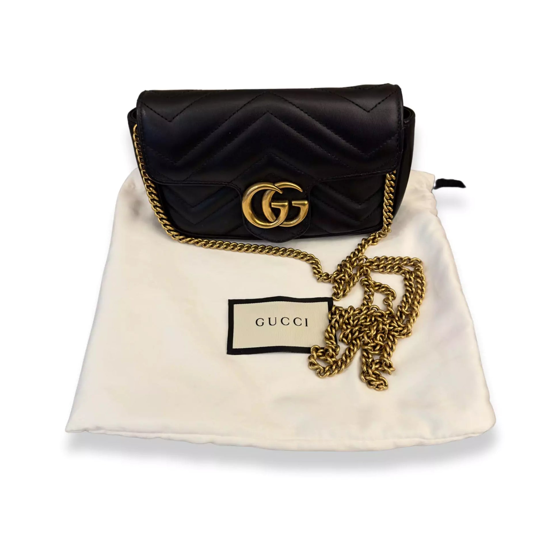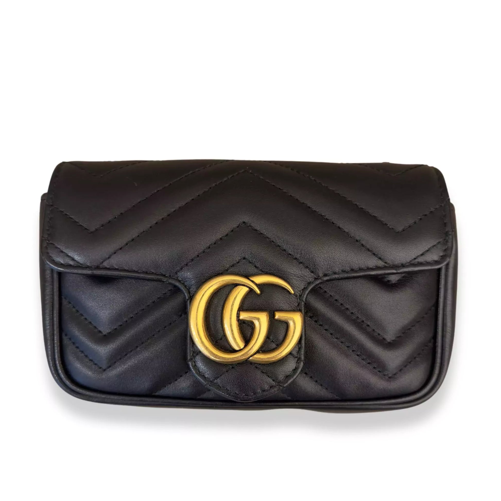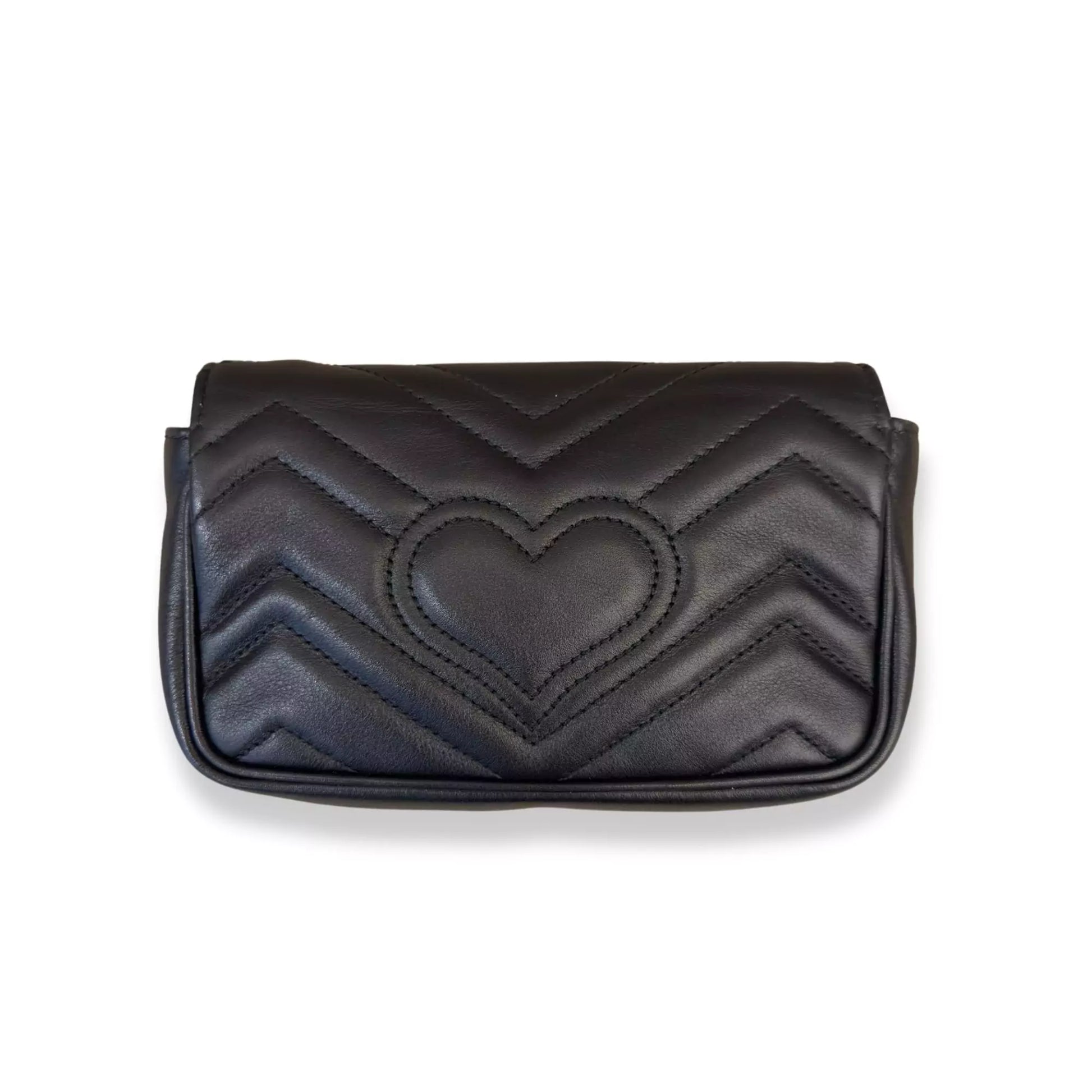 El bolso Gucci GG Marmont Micro de piel negra es un bolso compacto y lujoso que luce el icónico logotipo GG de Gucci y está confeccionado en piel matelassé negra de primera calidad. Destaca por su elegante diseño, realzado por su distintivo estampado de chevrones y sus finos herrajes dorados.