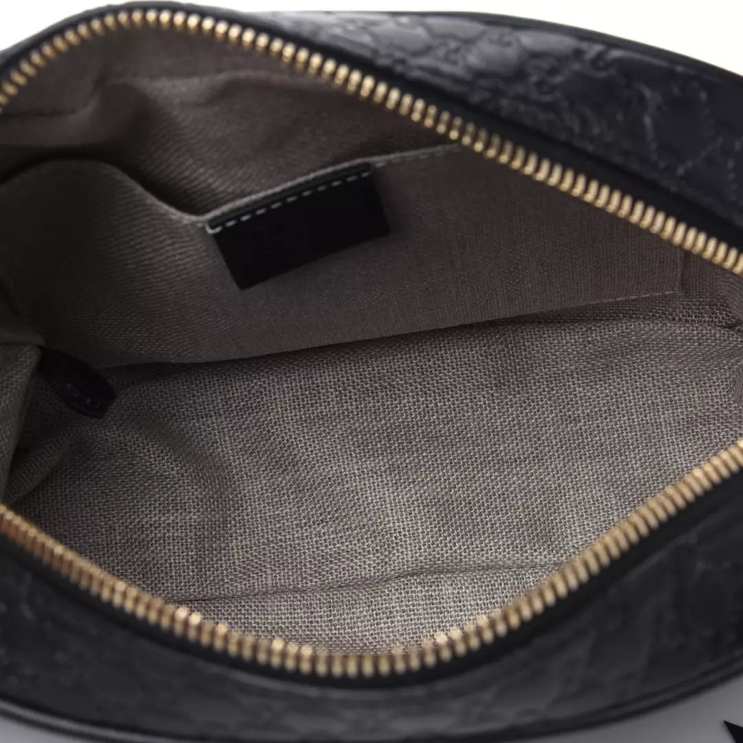 Este bolso bandolera está confeccionado en piel con micromonograma Guccissima en color negro. Cuenta con una correa de hombro de piel y un tirador de cremallera decorativo dorado. Se abre a un interior de tela con un panel de piel negra para tarjetas y un bolsillo de parche.
