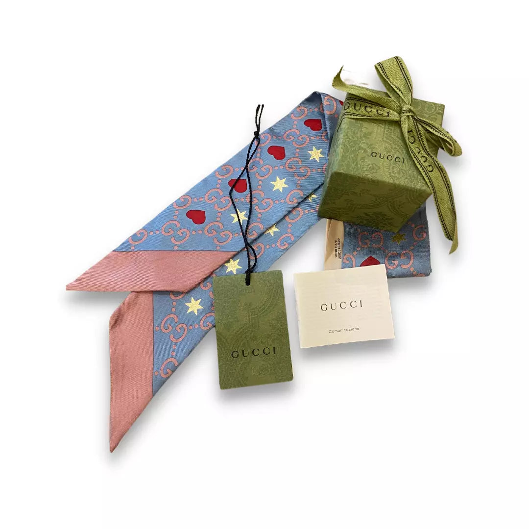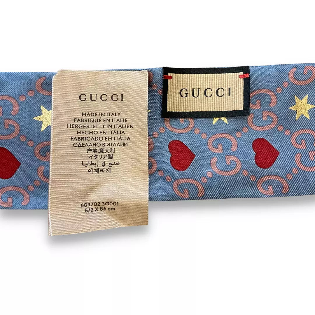 Lazo de seda con estampado GG azul de Gucci. Luce un colorido estampado que combina tonos azules y rosas . Se encuentra en perfecto estado.