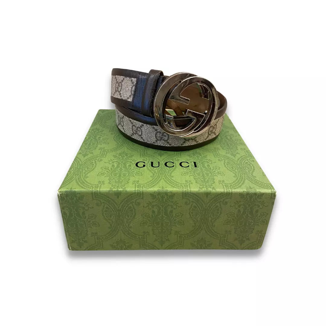 Este cinturón Gucci de lona beige y piel con doble G, confeccionado en lona GG Supreme y decorado con herrajes plateados, luce la icónica hebilla de doble G. Este accesorio combina elegancia y estilo, convirtiéndolo en una pieza atemporal para tu armario.