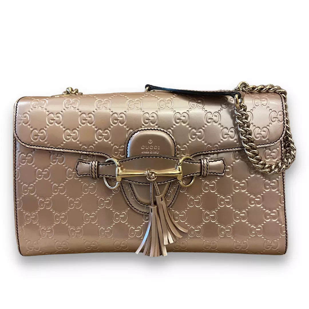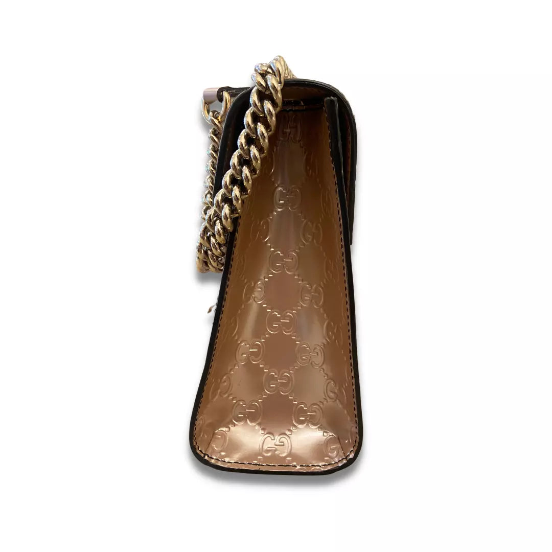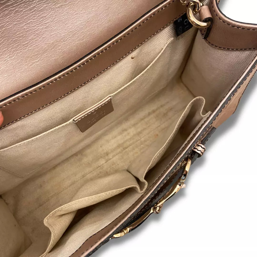 Bolso de cadena Gucci Horsebit 1995 de segunda mano , confeccionado en charol GG Supreme combinado con el distintivo Horsebit de la Casa. Está adornado con dos borlas y rematado con un asa de cadena dorada.