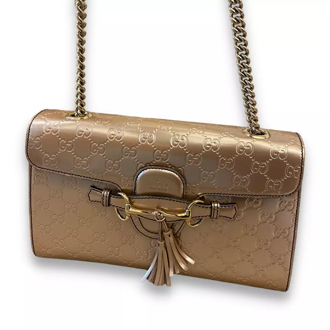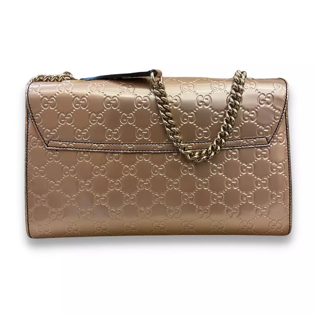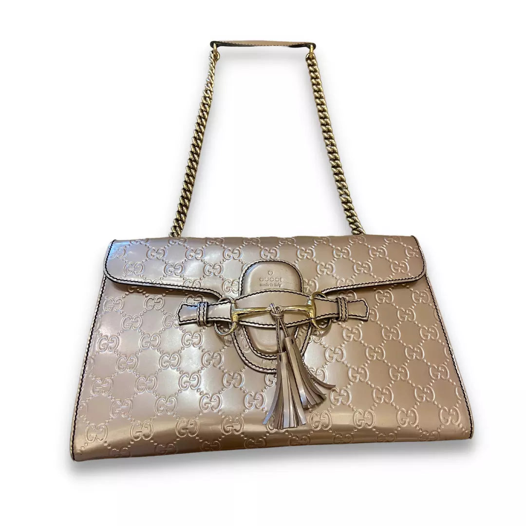 Bolso de cadena Gucci Horsebit 1995 de segunda mano , confeccionado en charol GG Supreme combinado con el distintivo Horsebit de la Casa. Está adornado con dos borlas y rematado con un asa de cadena dorada.