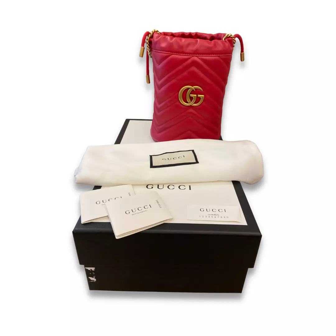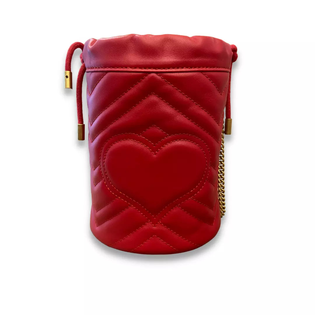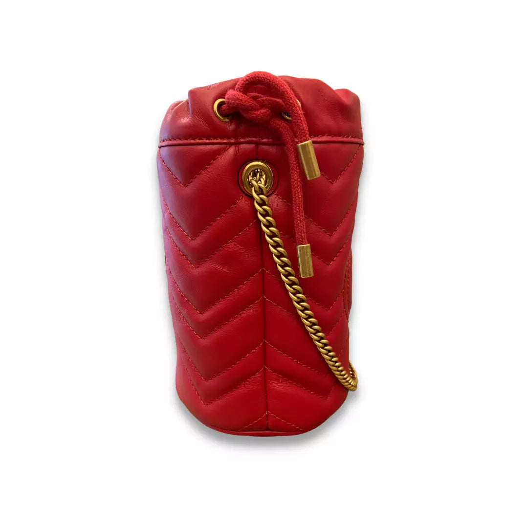 Bolso cubo mini GG Gucci Marmont rojo completamente nuevo, confeccionado en piel matelassé roja con un elegante motivo de chevrones. La parte frontal de este accesorio luce el icónico emblema de la Doble G. Con correa de cadena y cierre de cordón, este versátil bolso se puede llevar como bandolera, ofreciendo elegancia y funcionalidad en un diseño chic.