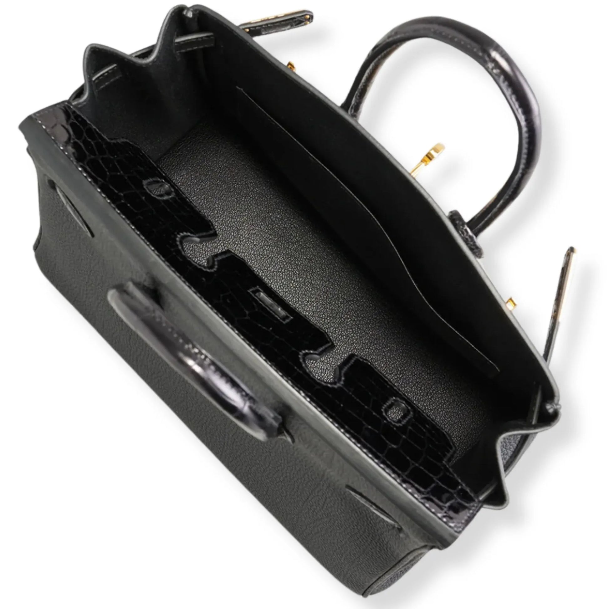 Hermès Birkin 25, elaborado artesanalmente en piel de Togo negra y piel de cocodrilo, con herrajes dorados. Impecable, con plásticos en los herrajes.