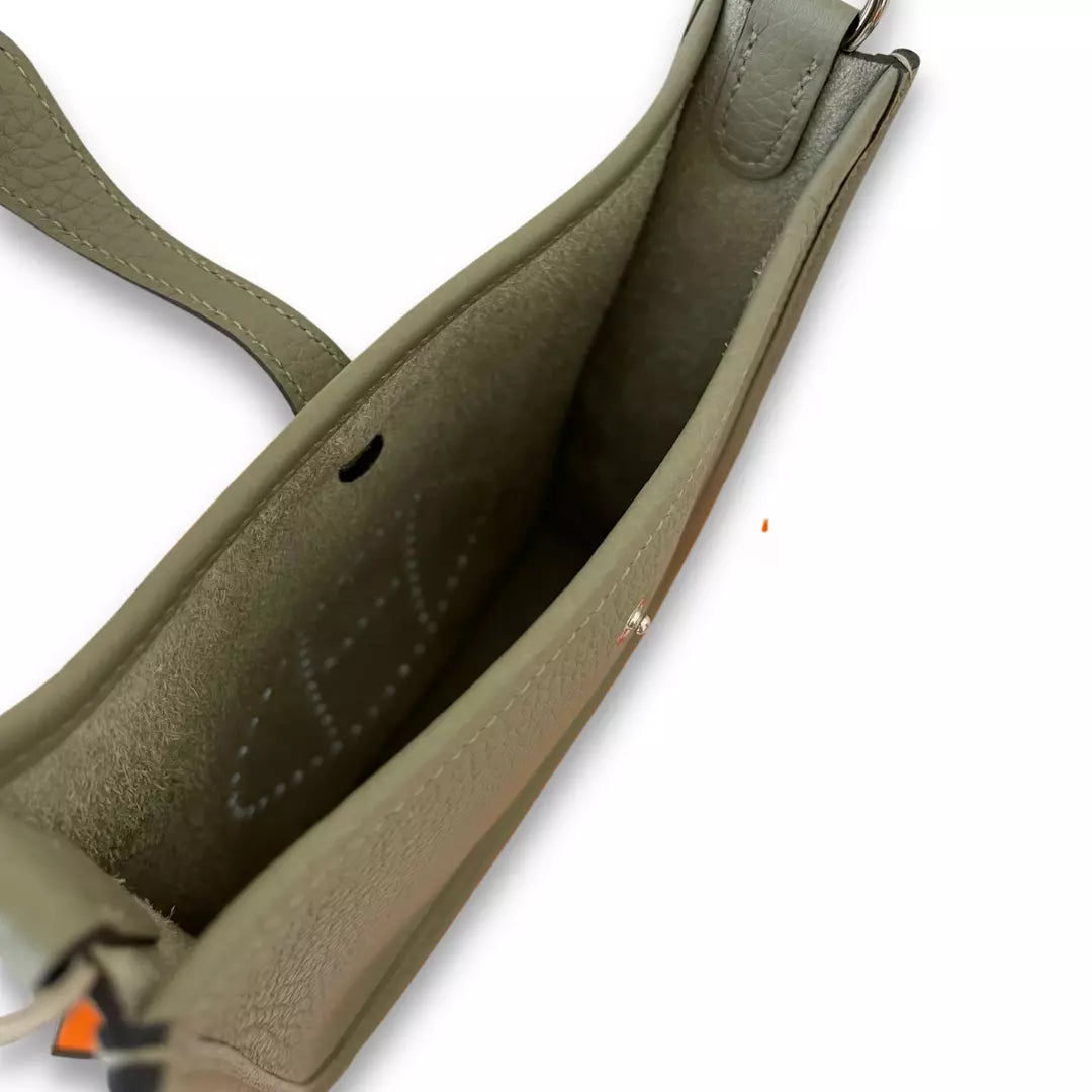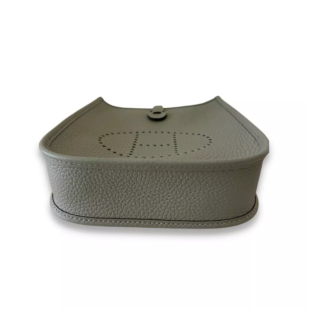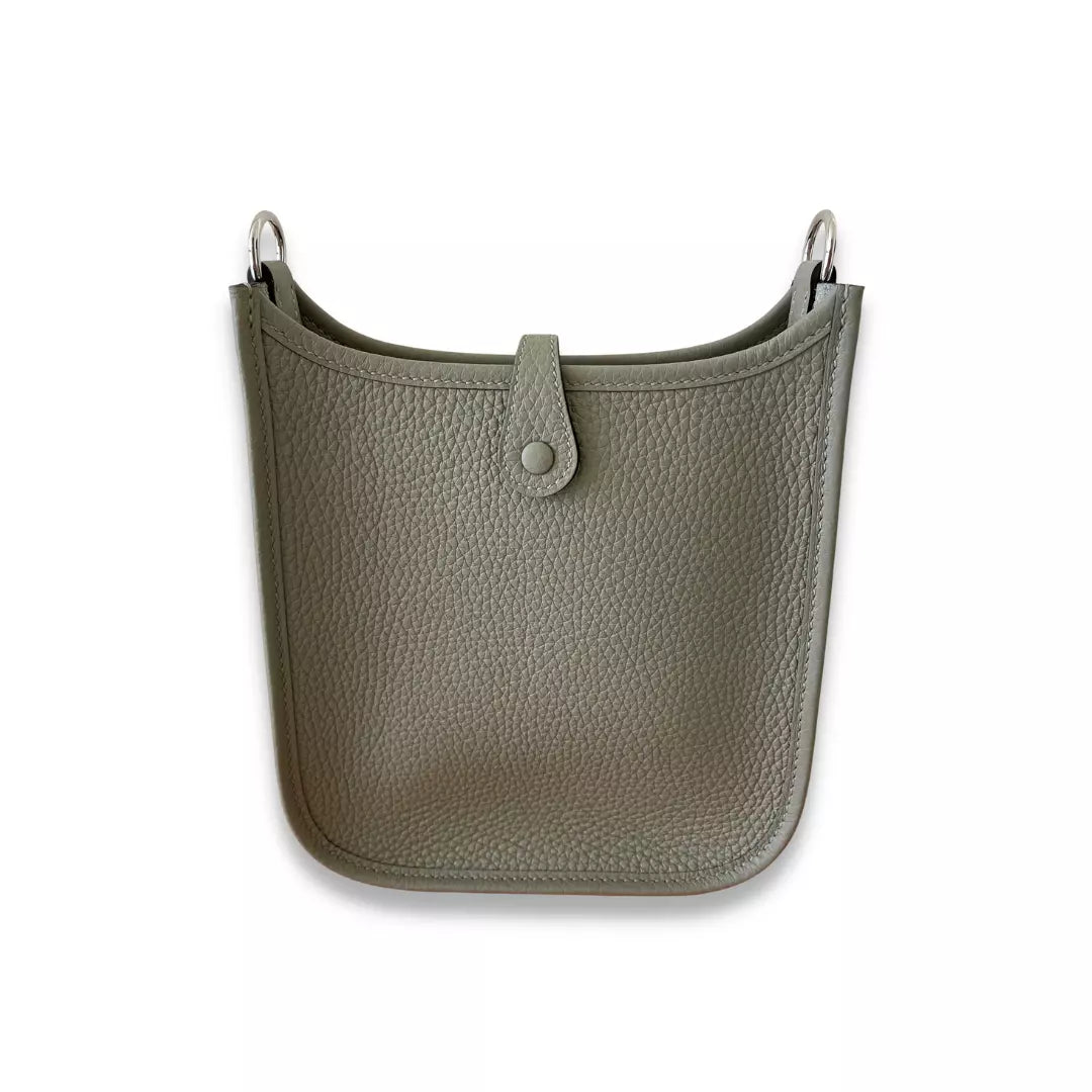 Bolso bandolera Hermès Evelyne 16 Amazone en piel Sage Clemence con correa de hombro de lana gris, "H" de piel perforada, cierre con lengüeta de piel y herrajes de paladio.