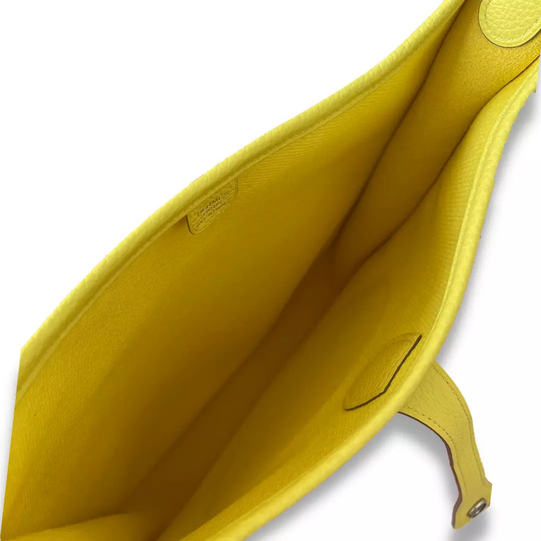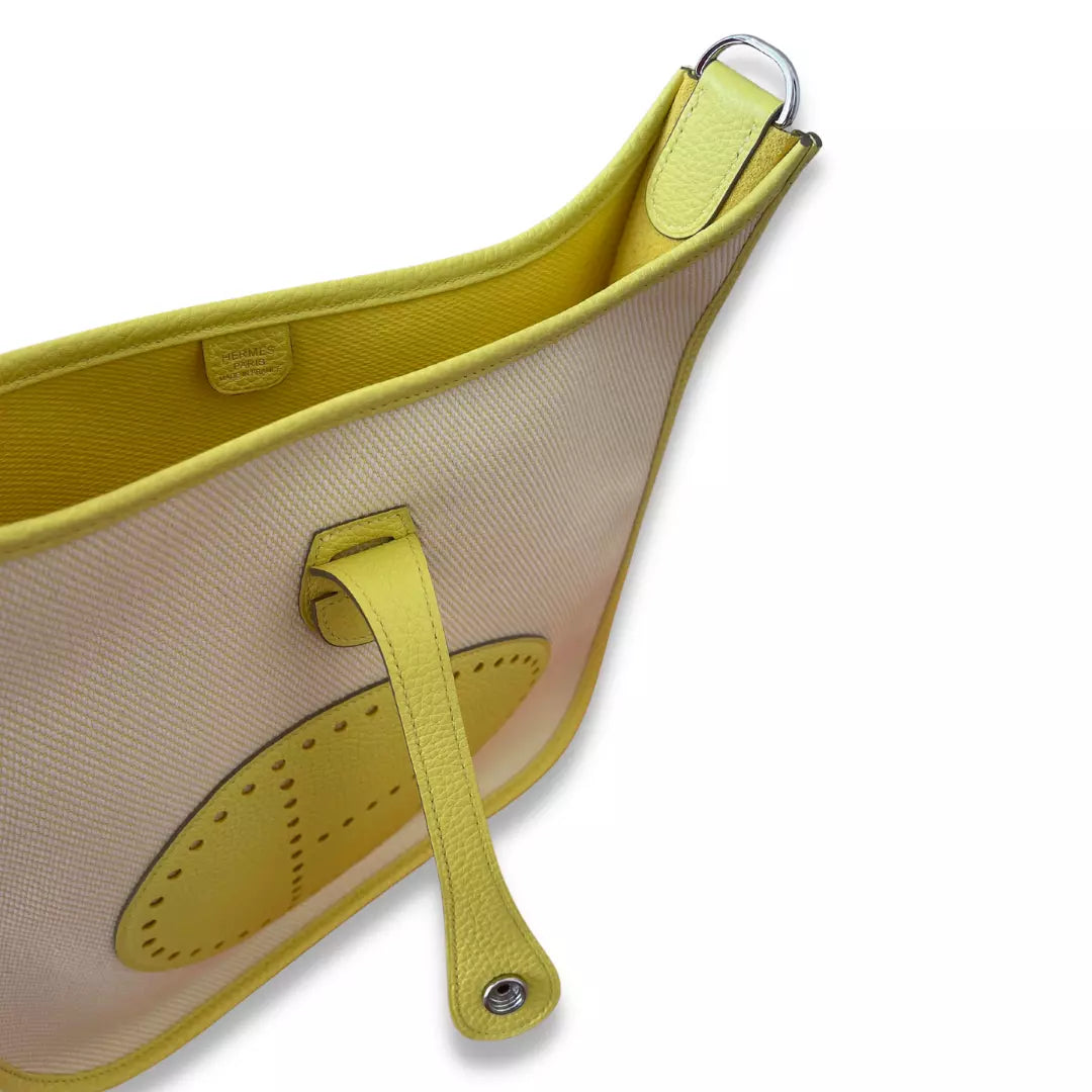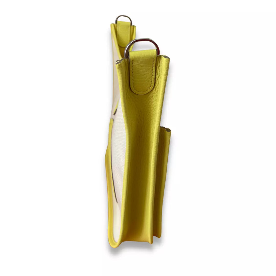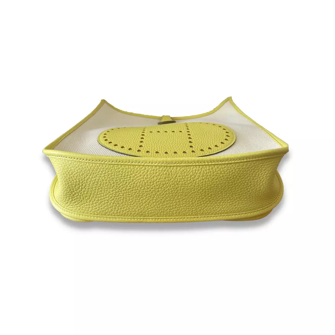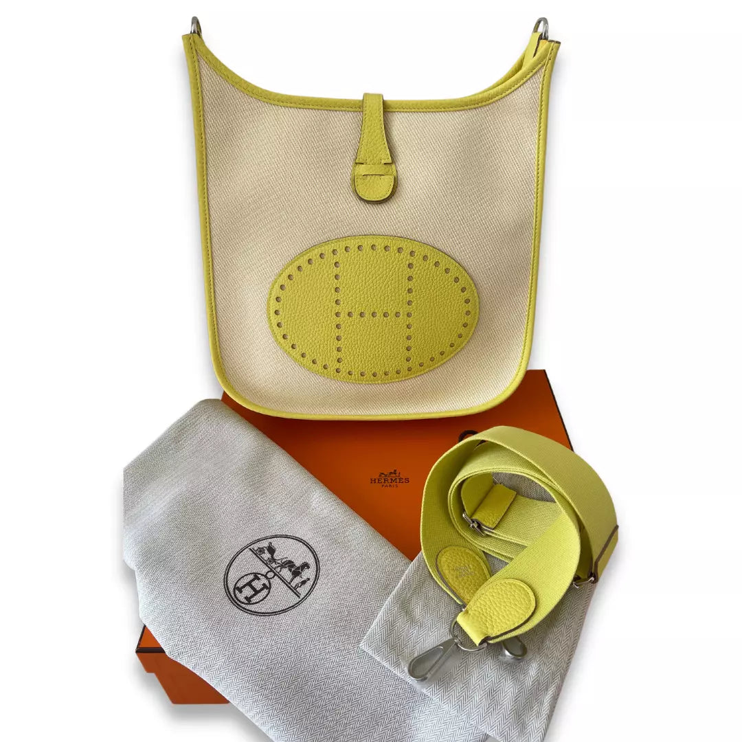 Hermès Evelyne 29 100 % auténtico. Este Evelyne Poche III combina piel Taurillon Clemence color crudo y citrino/lima. Incluye herrajes de paladio.