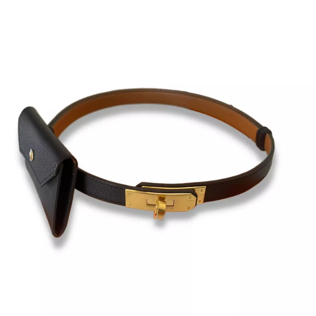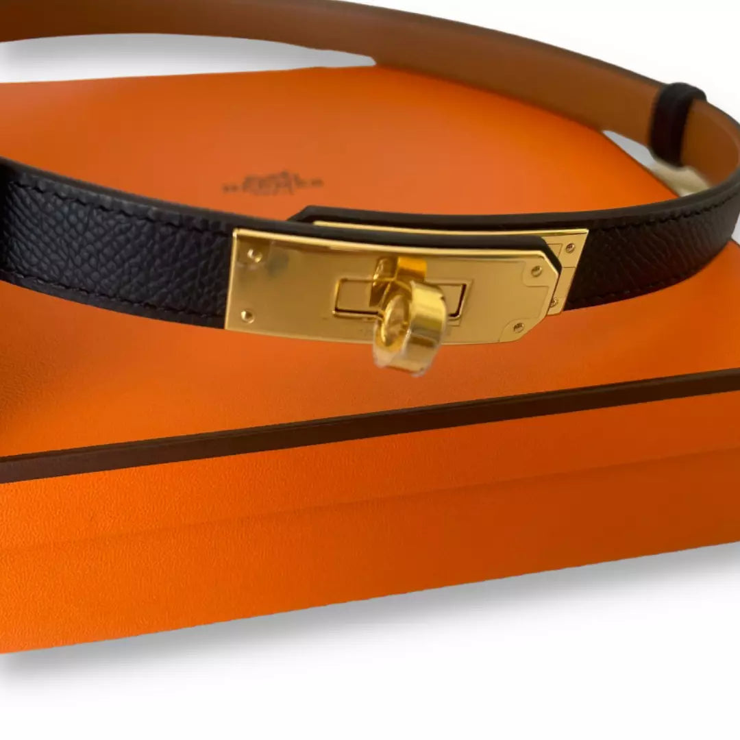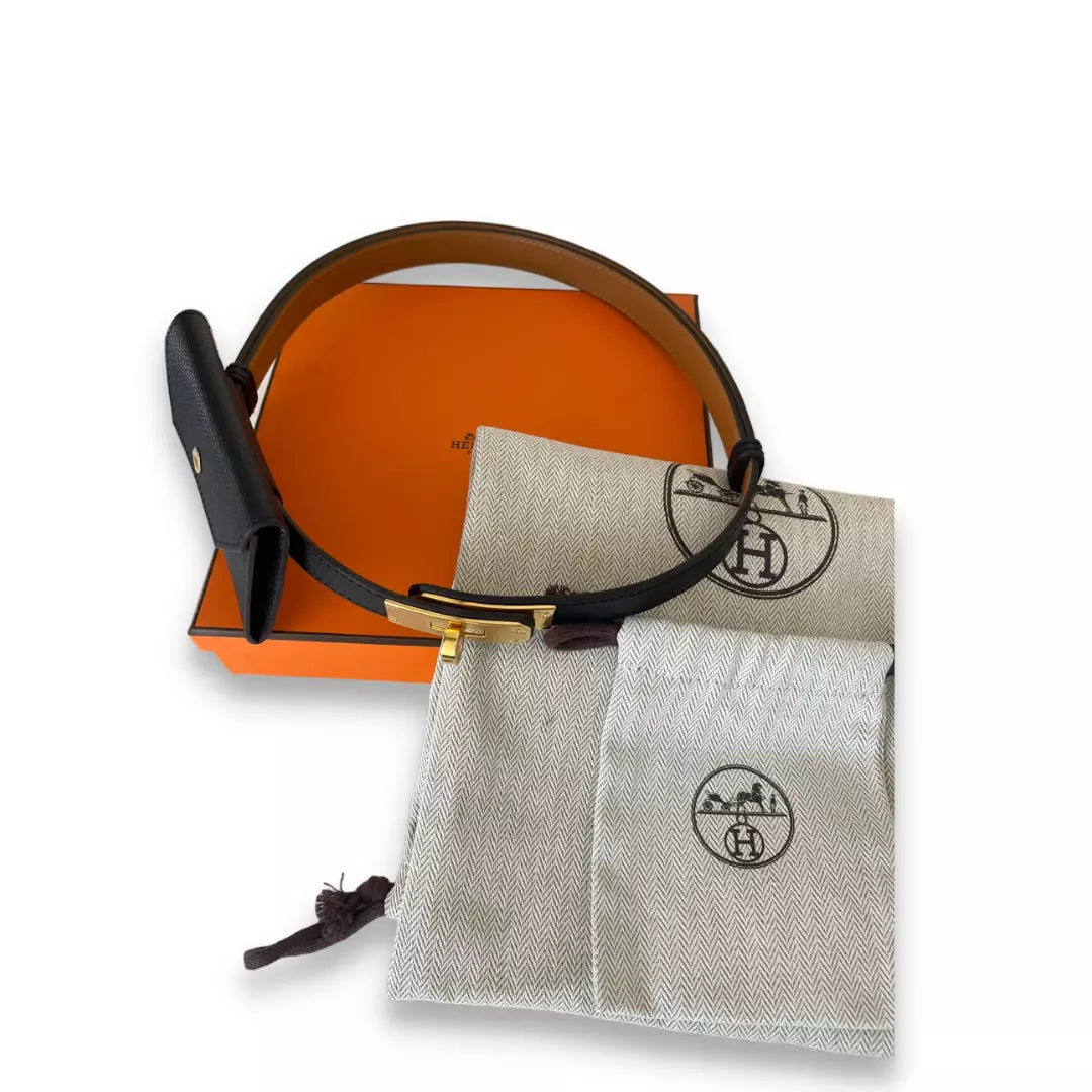 Este Nuevo cinturón Hermès Kelly Pocket de piel Epsom negra con hebilla dorada y sistema deslizante para ajustar la talla. Se puede llevar en la cintura o la cadera.