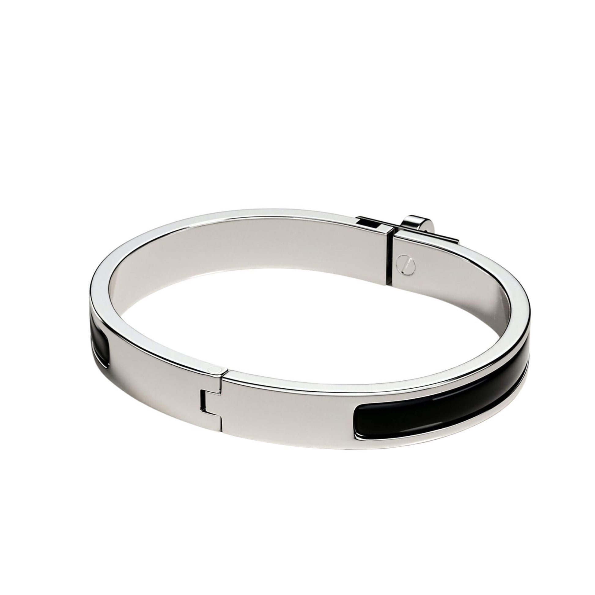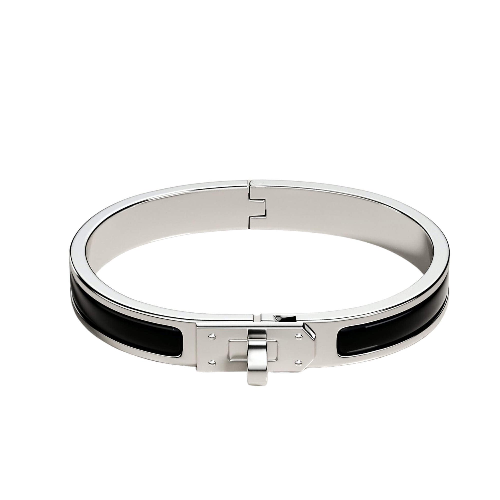 Esta NUEVA pulsera Hermès está hecha de esmalte con un acabado bañado en paladio. Combina con el icónico tono noir de la marca. El cierre del brazalete representa el del icónico bolso Kelly de Hermès.