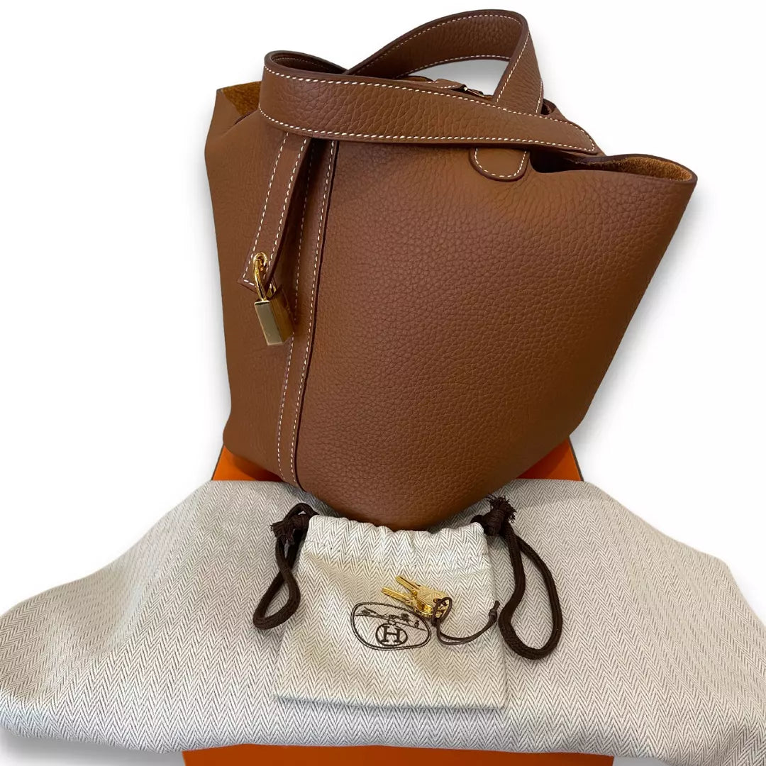 Hermès Picotine 18 en piel Gold Clemence (color clásico de Hermès) con herrajes dorados. El interior está forrado en piel natural, no tiene bolsillos interiores y se cierra con un candado. Impecable (sin usar).