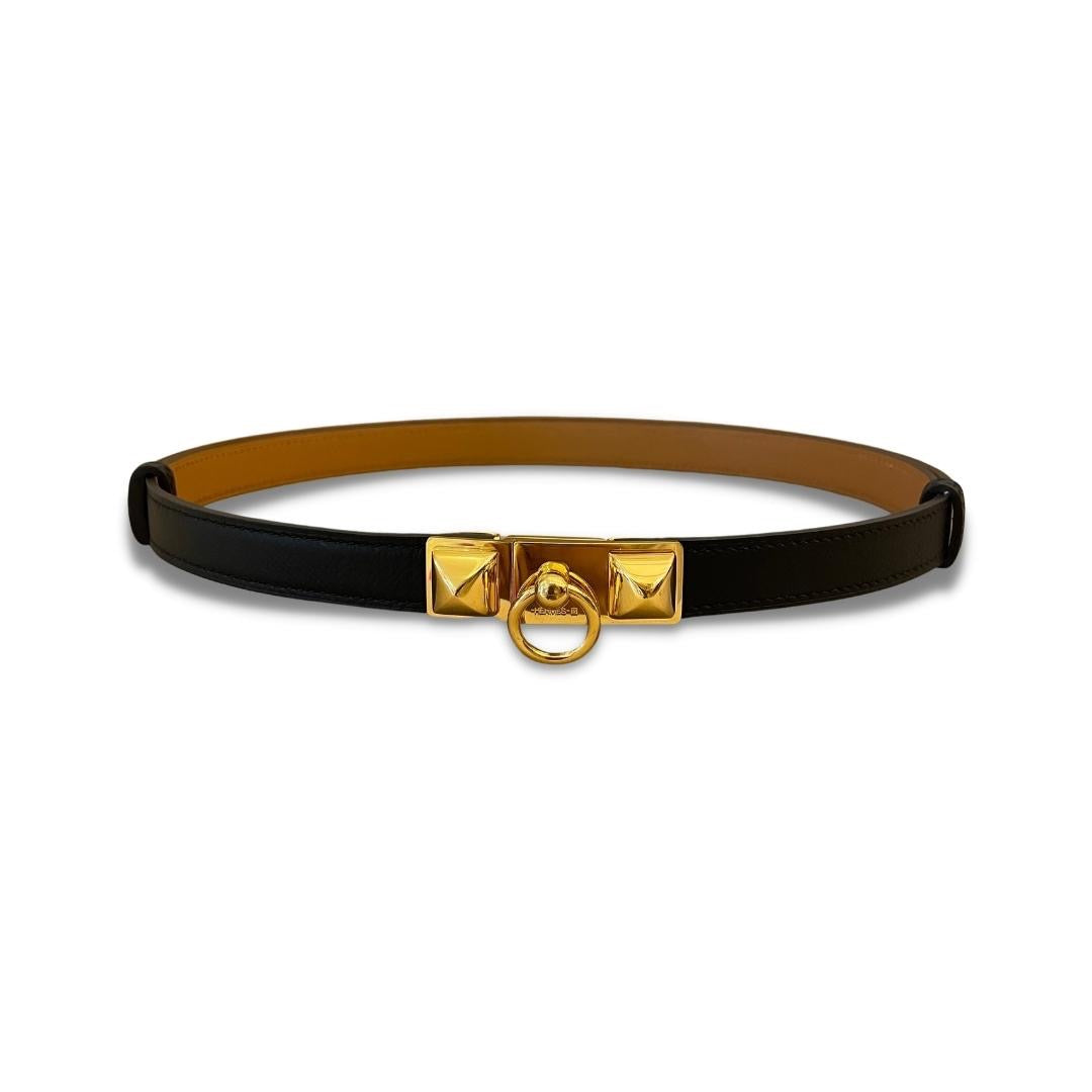 Este Nuevo cinturón Hermès Rivale 18 de piel Epsom negra con hebilla dorada y sistema deslizante para ajustar la talla. Se puede llevar en la cintura o en la cadera.
