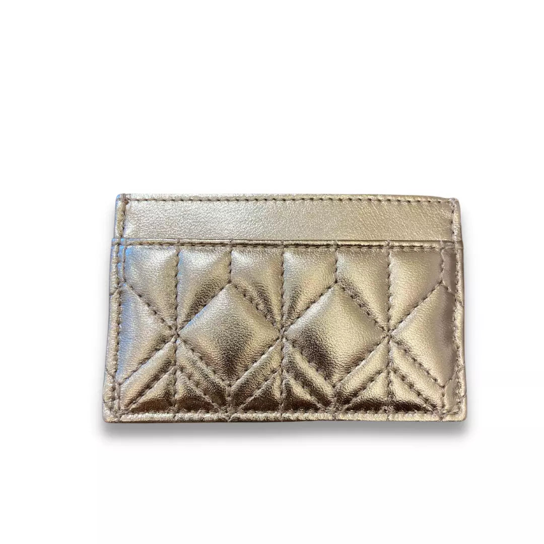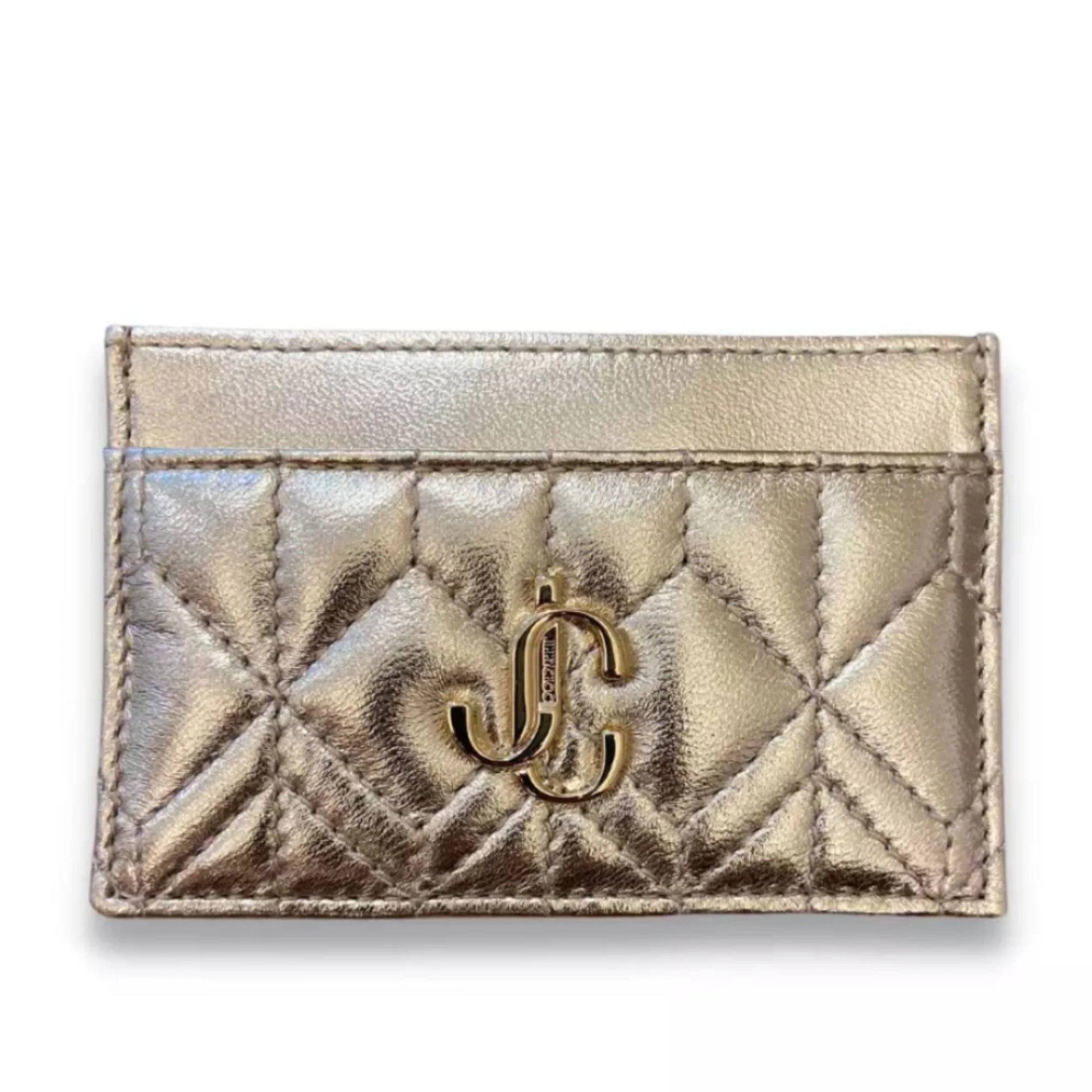 Este tarjetero Jimmy Choo elaborado en cuero dorado con diseño de chevron y el logotipo JC en el frente se encuentra en excelentes condiciones.