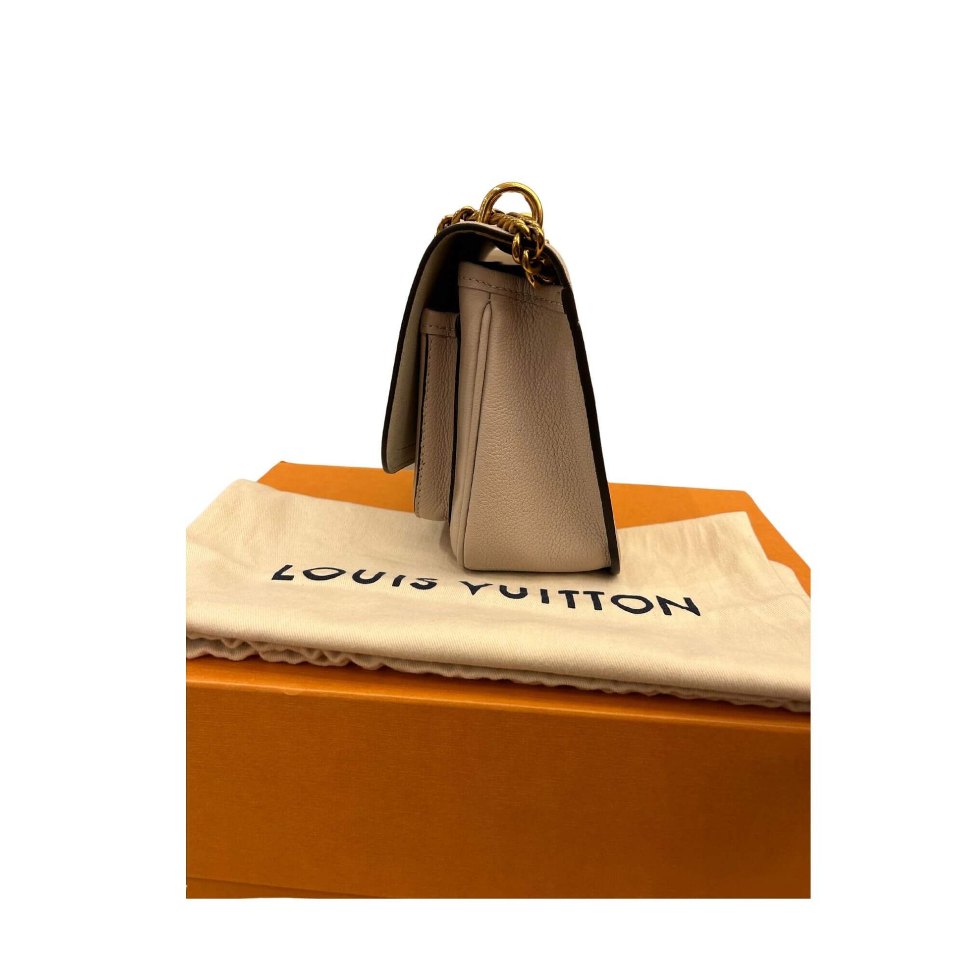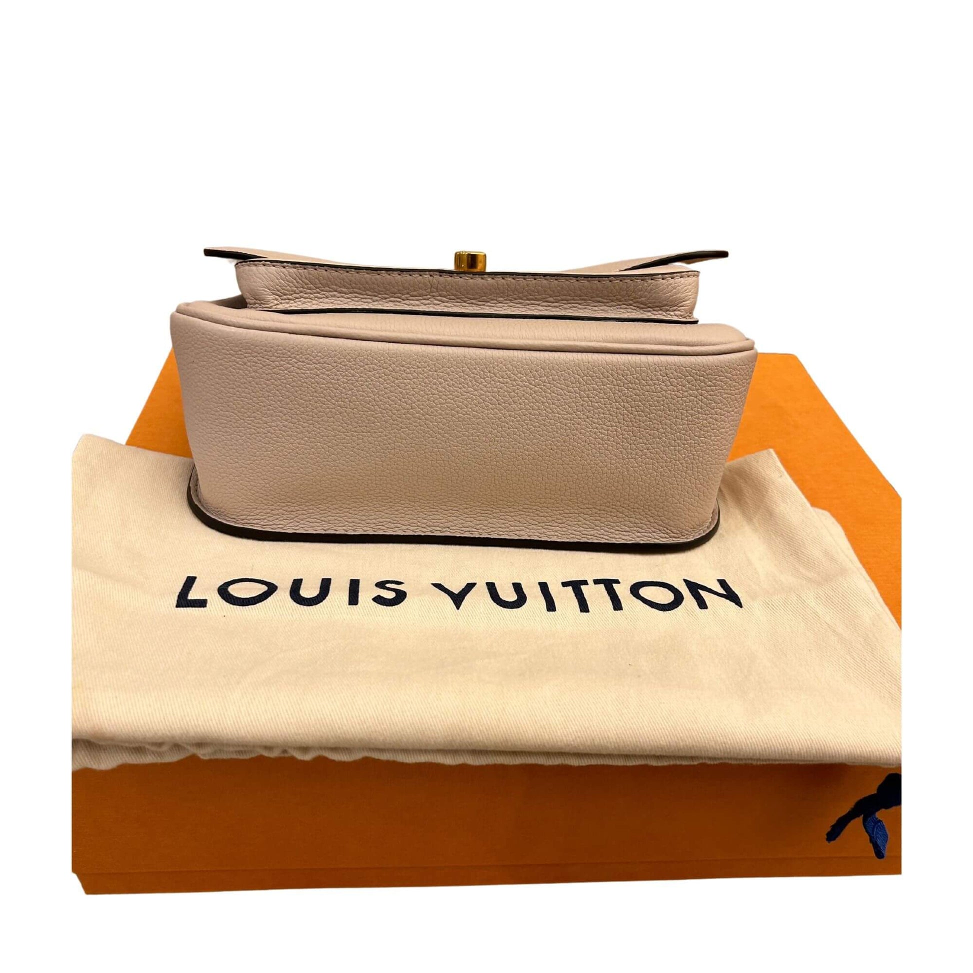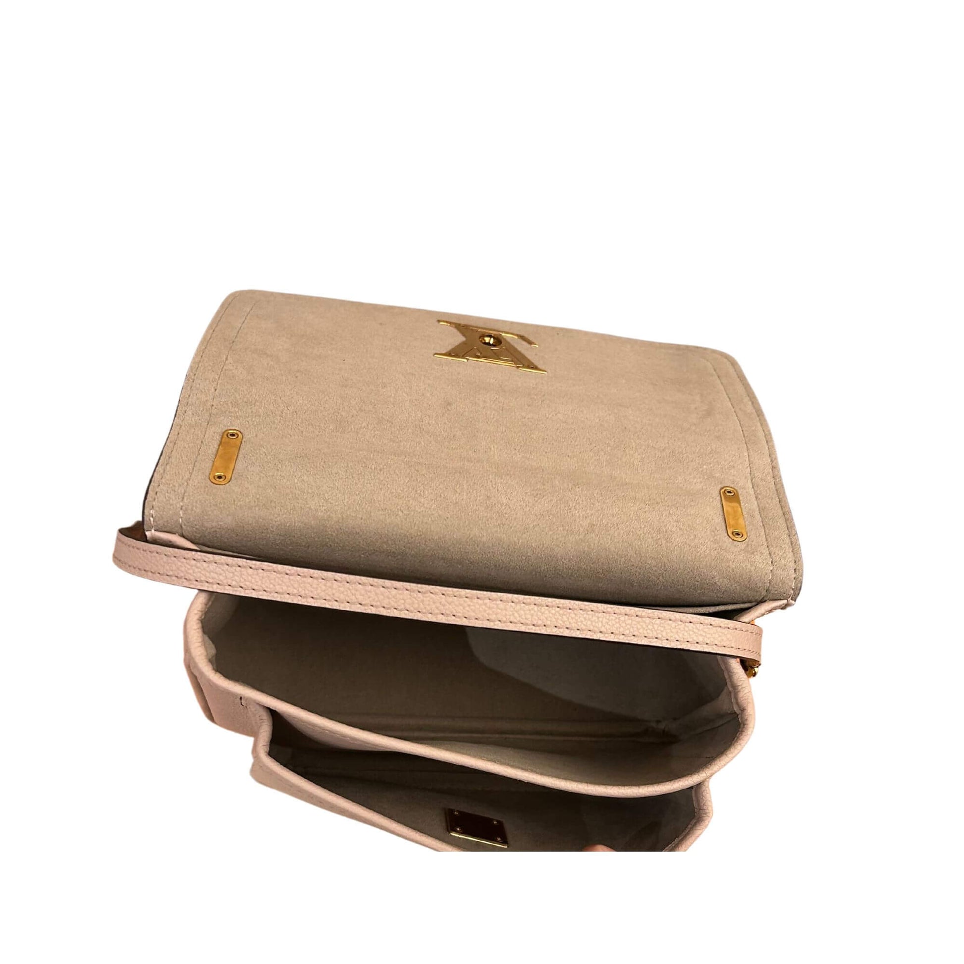 Este bolso Louis Vuitton de segunda mano está hecho de piel drapeada en color rosa bebé. Tiene una correa larga ajustable que se puede acortar para llevarlo al hombro. Todos los detalles son de metal dorado amarillo; la hebilla del bolsillo luce el logo LV de la marca en grande.