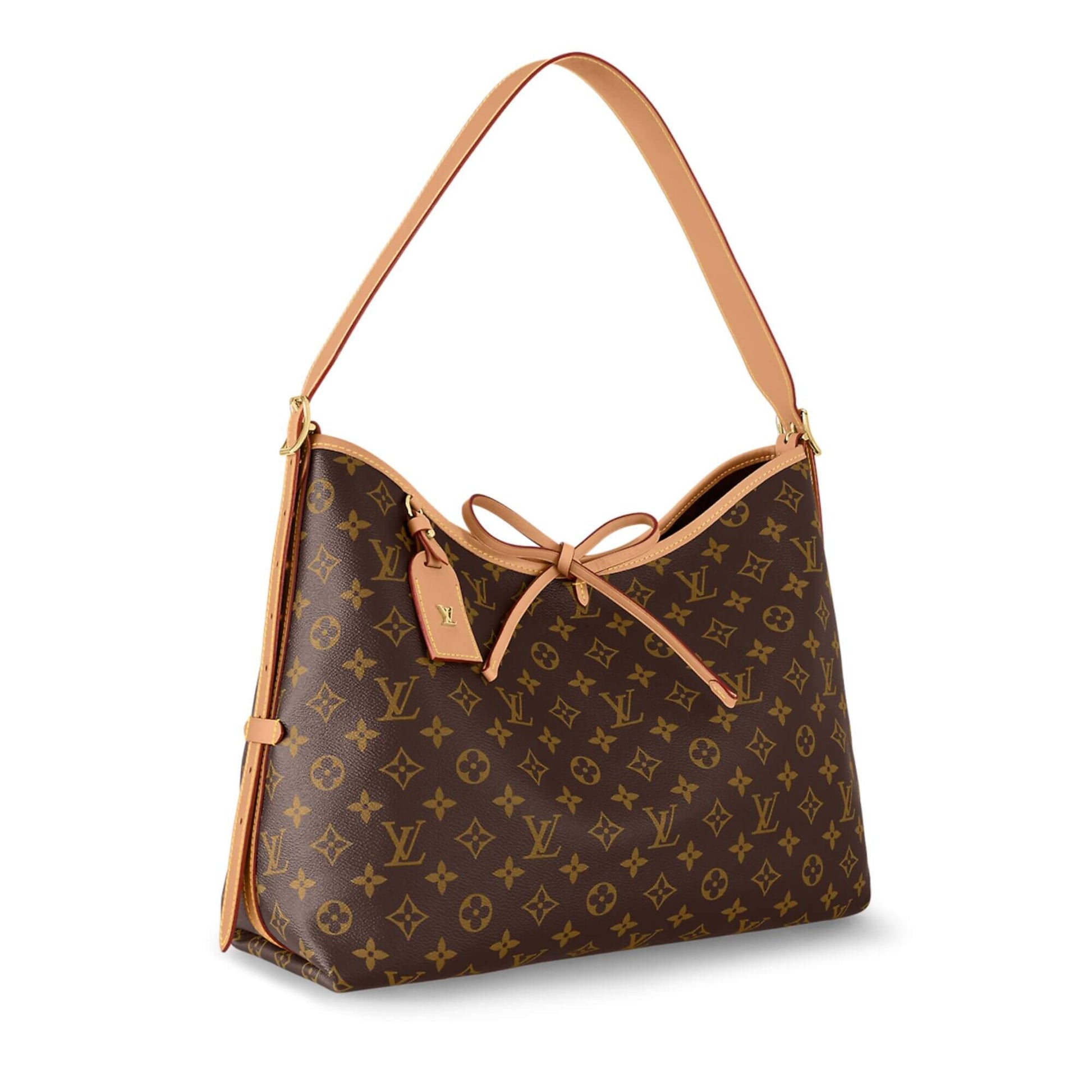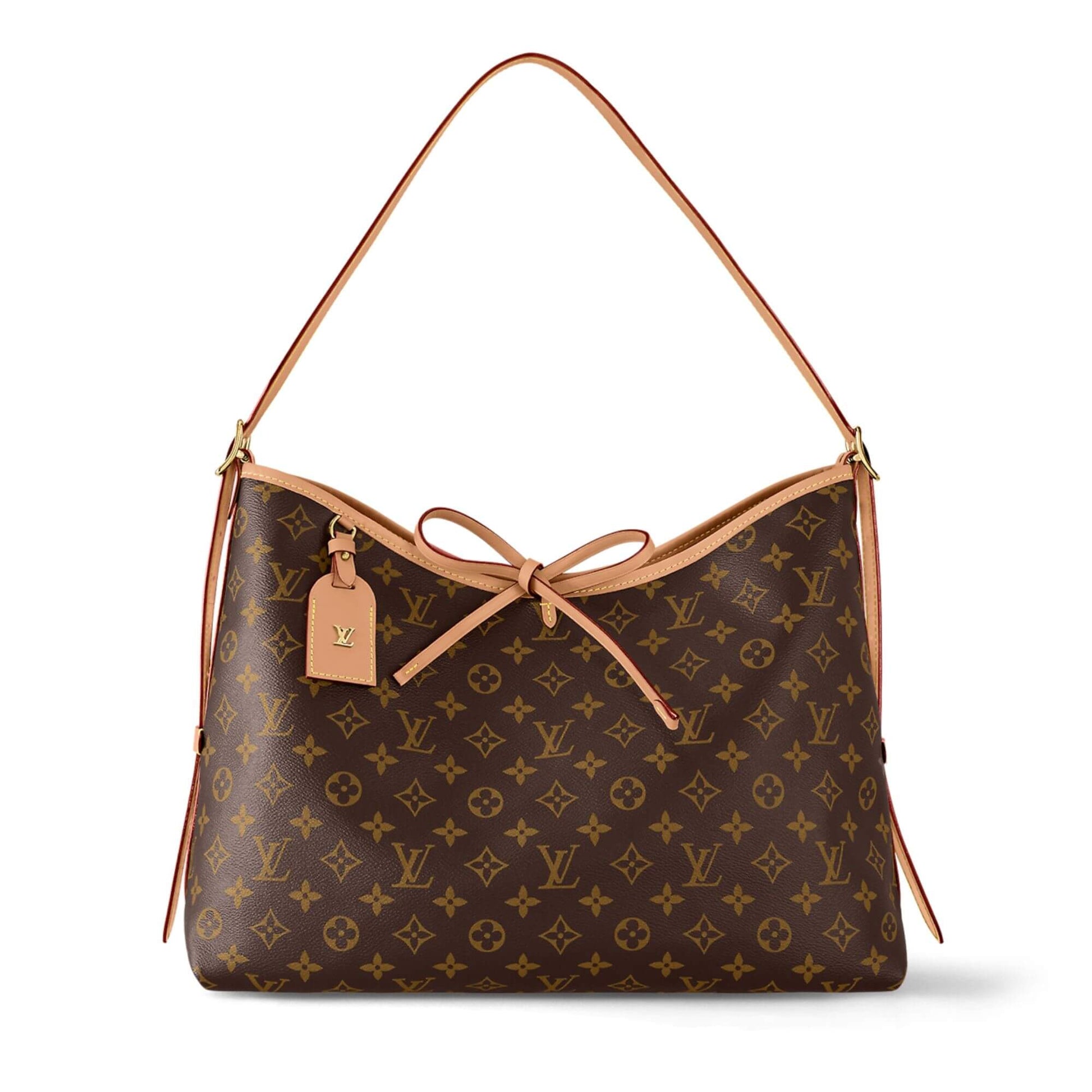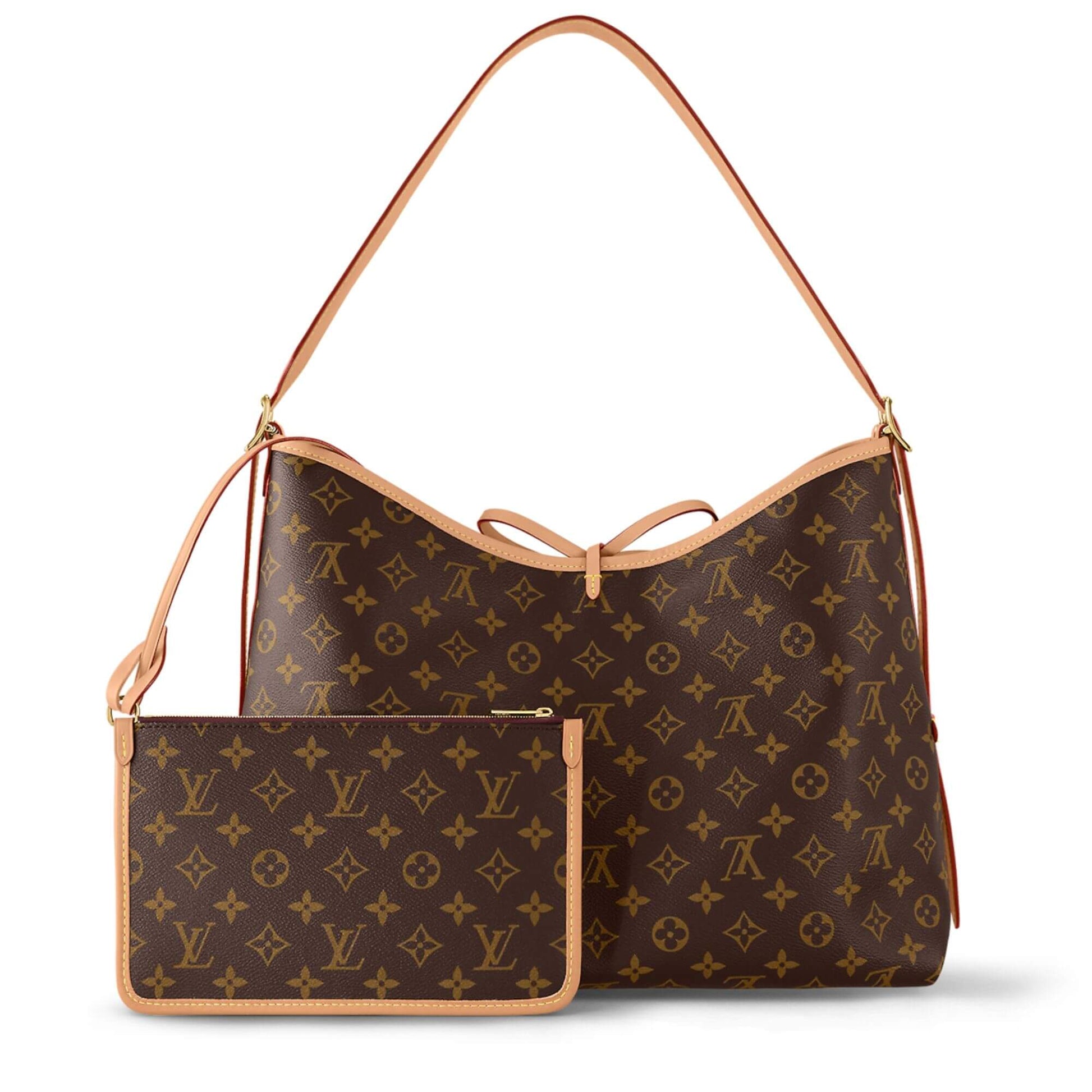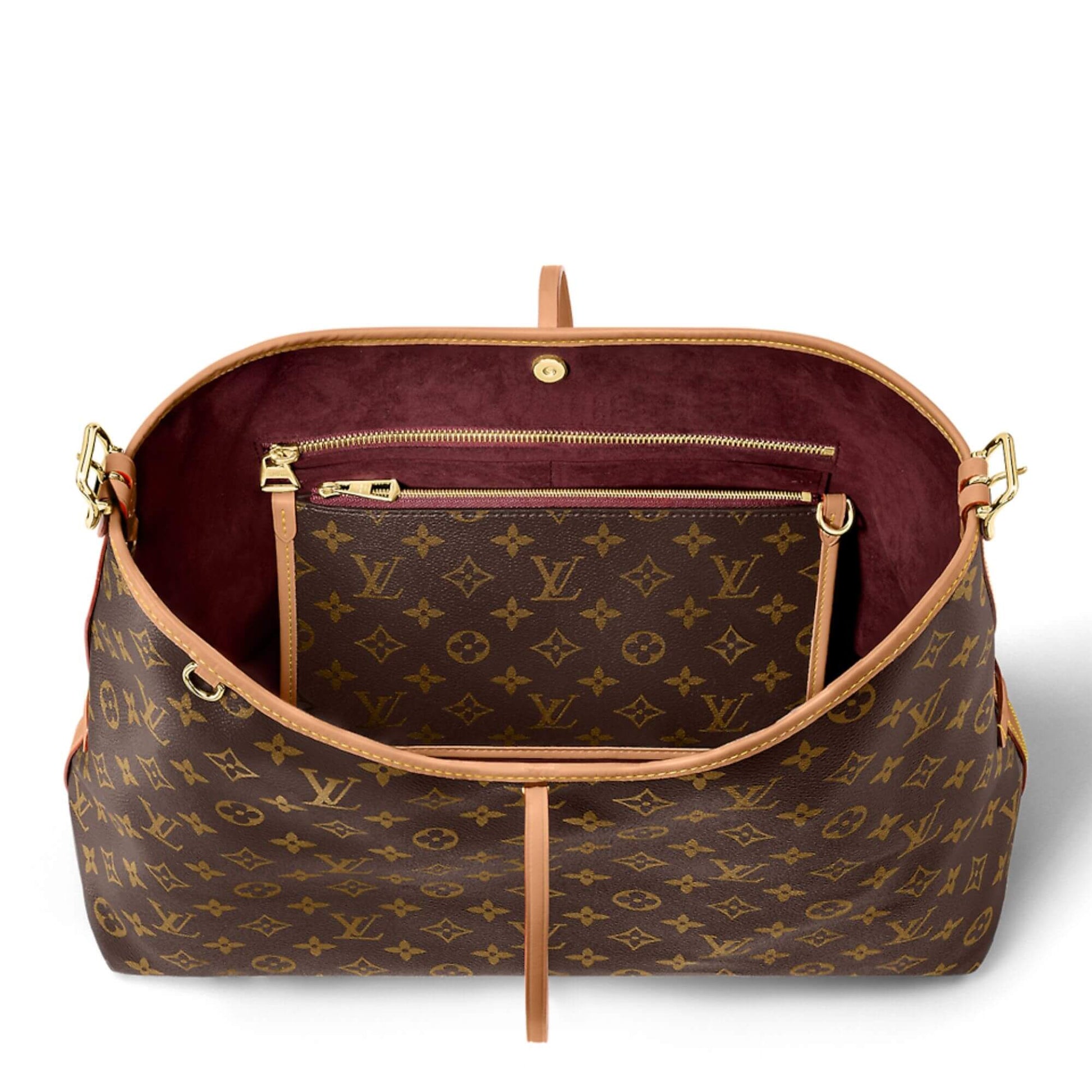 Este nuevo bolso tote Louis Vuitton está confeccionado en lona monograma marrón, con correas ajustables de cuero natural beige. Los detalles son de metal dorado con el logotipo de LV.