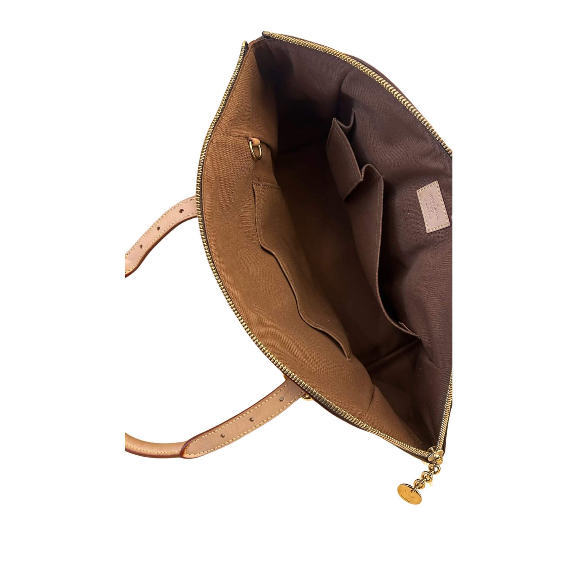 Este bolso Louis Vuitton de segunda mano está confeccionado en lona Monogram con todos los detalles en piel de becerro beige y herrajes dorados. Es una pieza icónica de la marca con un compartimento principal y tres bolsillos interiores.