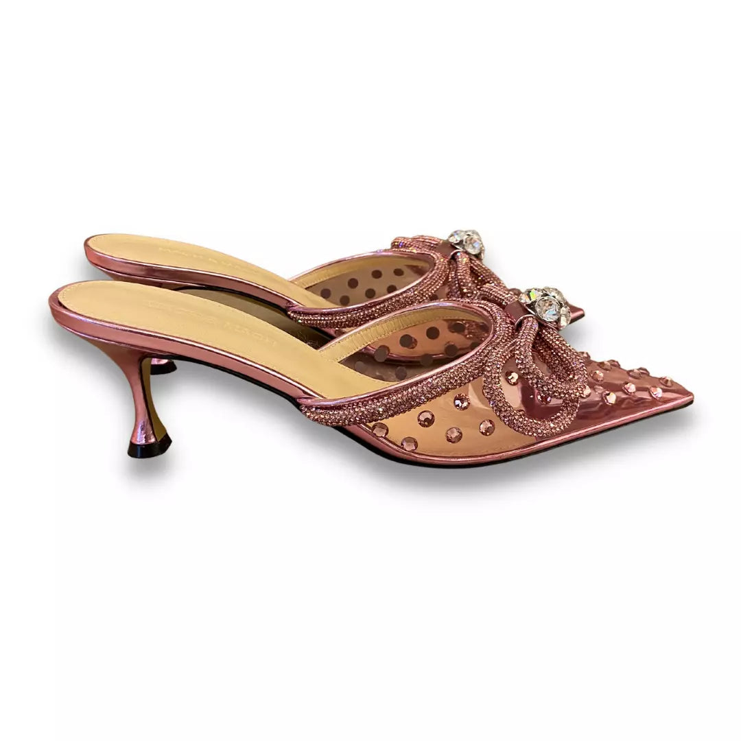 Estos zapatos de tacón tipo mules de PVC cristalizado rosa de Mach & Mach, con adornos de cristal y cinta, son completamente nuevos.
