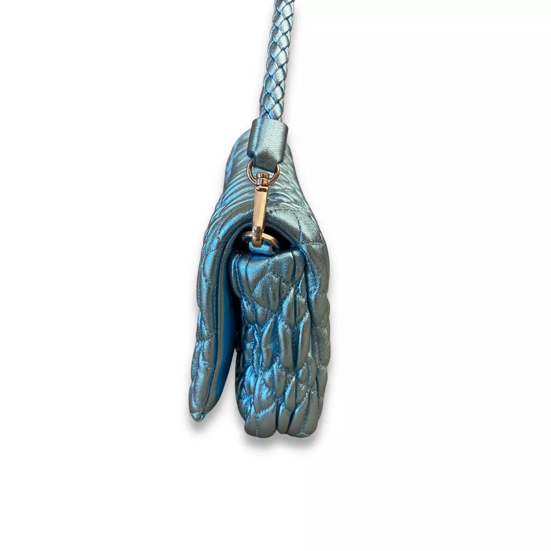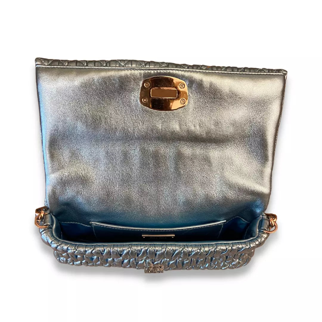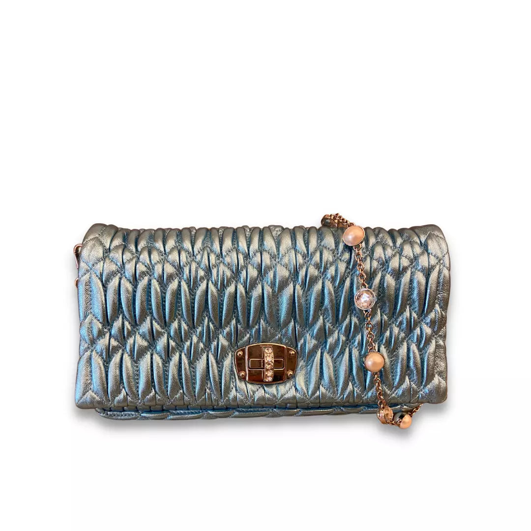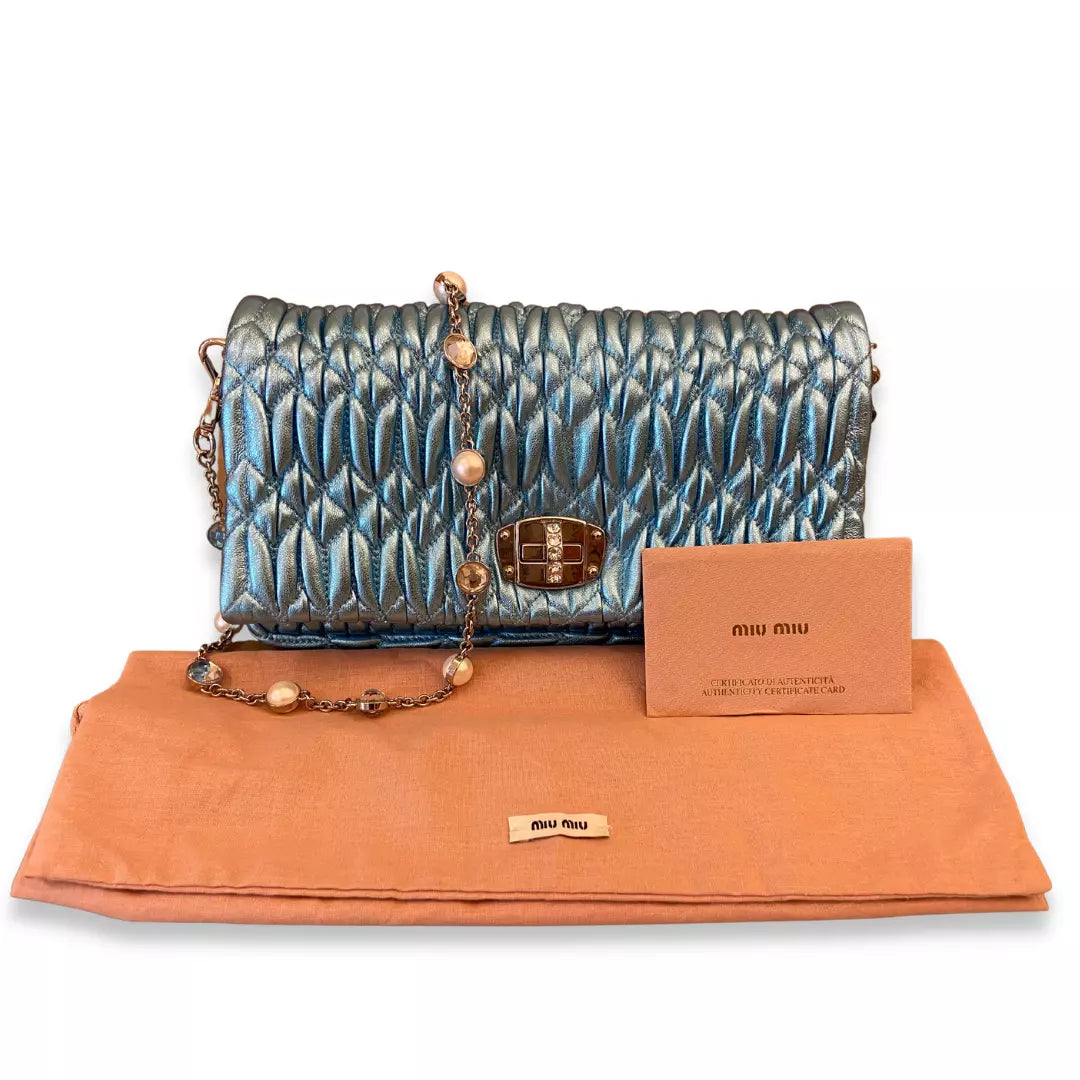 Bolso Miu Miu Crystal Pouchette de piel azul lago, usado, con cadena de plata, perla y cristales, inspirado en el mundo de la joyería. El bolso Miu Miu Crystal es uno de los bolsos más delicados y divertidos de la marca.