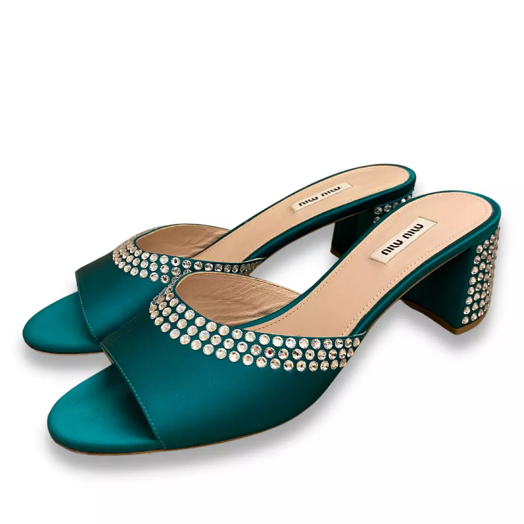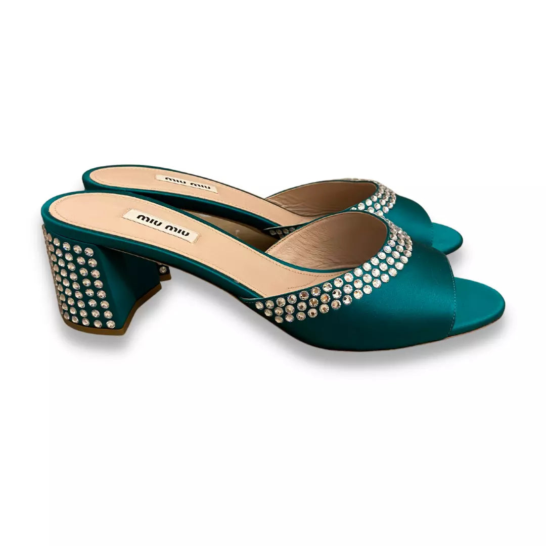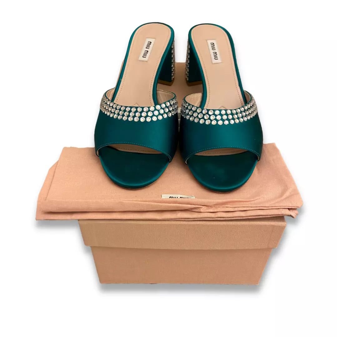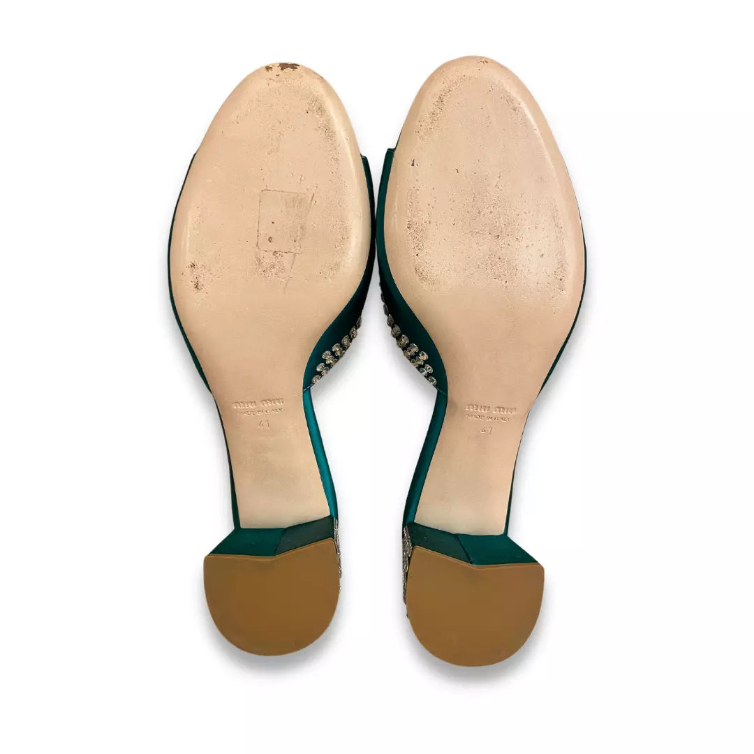 Estos zapatos de tacón de bloque con tacón de bloque y punta abierta en satén verde con cristales de Miu Miu usados, con adorno de cristal, están en muy buenas condiciones.