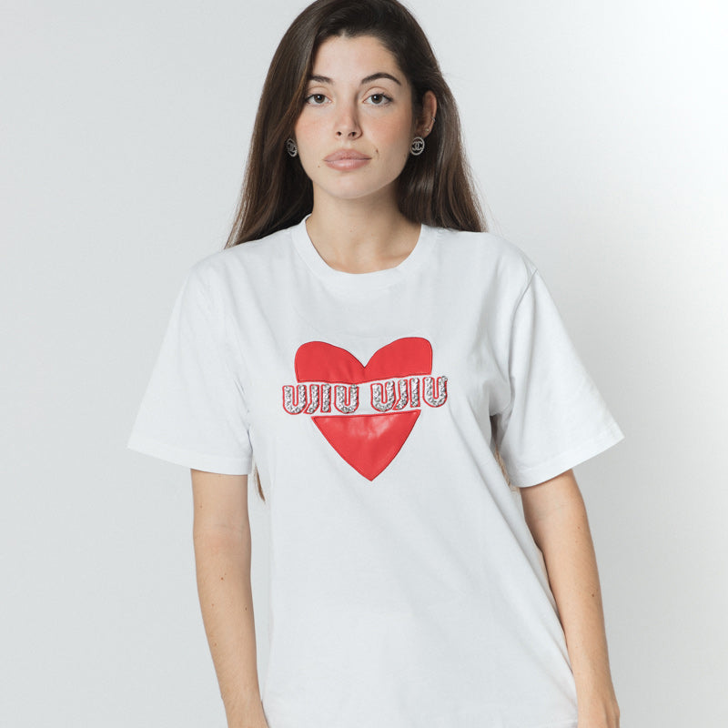 Esta camiseta con corazón y logo adornado en algodón blanco y rojo de Miu Miu usada está en muy buenas condiciones.