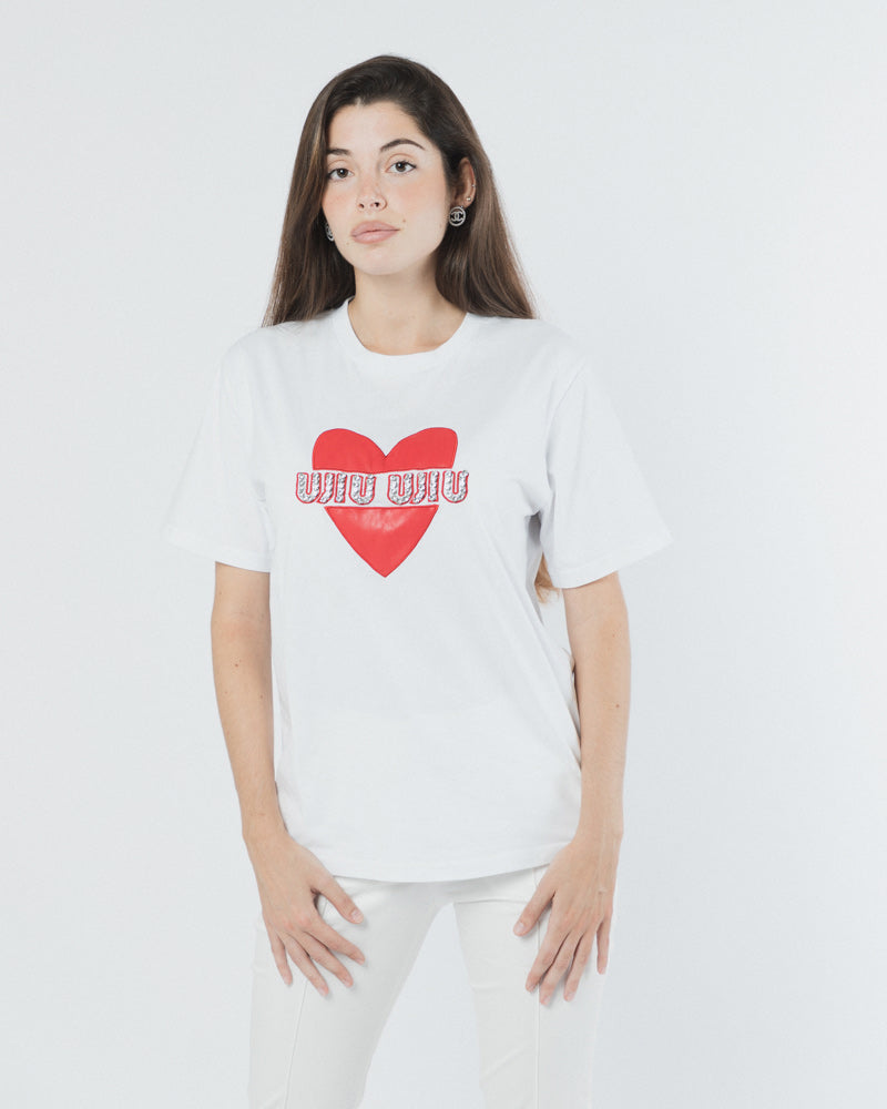 CAMISETA DE ALGODÓN BLANCA CON CORAZONES ADORNADOS DE MIU MIU
