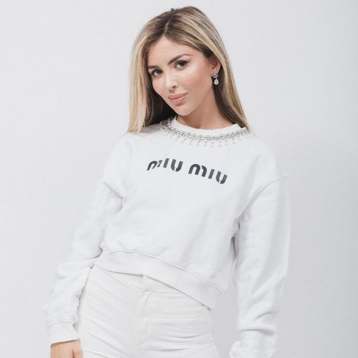 Sudadera de manga larga con cuello redondo adornado con cristales y logo adornado en algodón blanco de Miu Miu, usada.