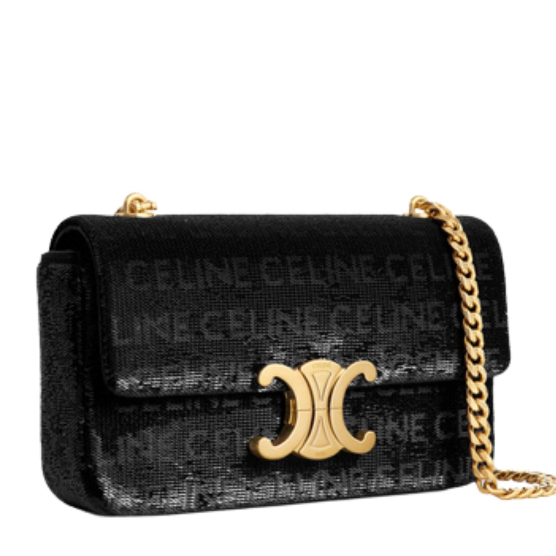 This NEW Celine shoulder bag is made out of black satin with sequins with ''Celine'' printed all over it. It has lambskin lining in the interior, all details are made out of golden finish, in the front it has the brands iconic triomphe closure.