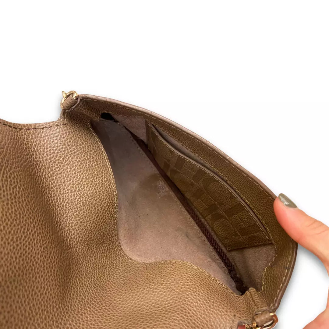 This Pre-loved CH Carolina Herrera Brown Leather Clutch Bag in Beige color and CH logo is in a Very Good condition.