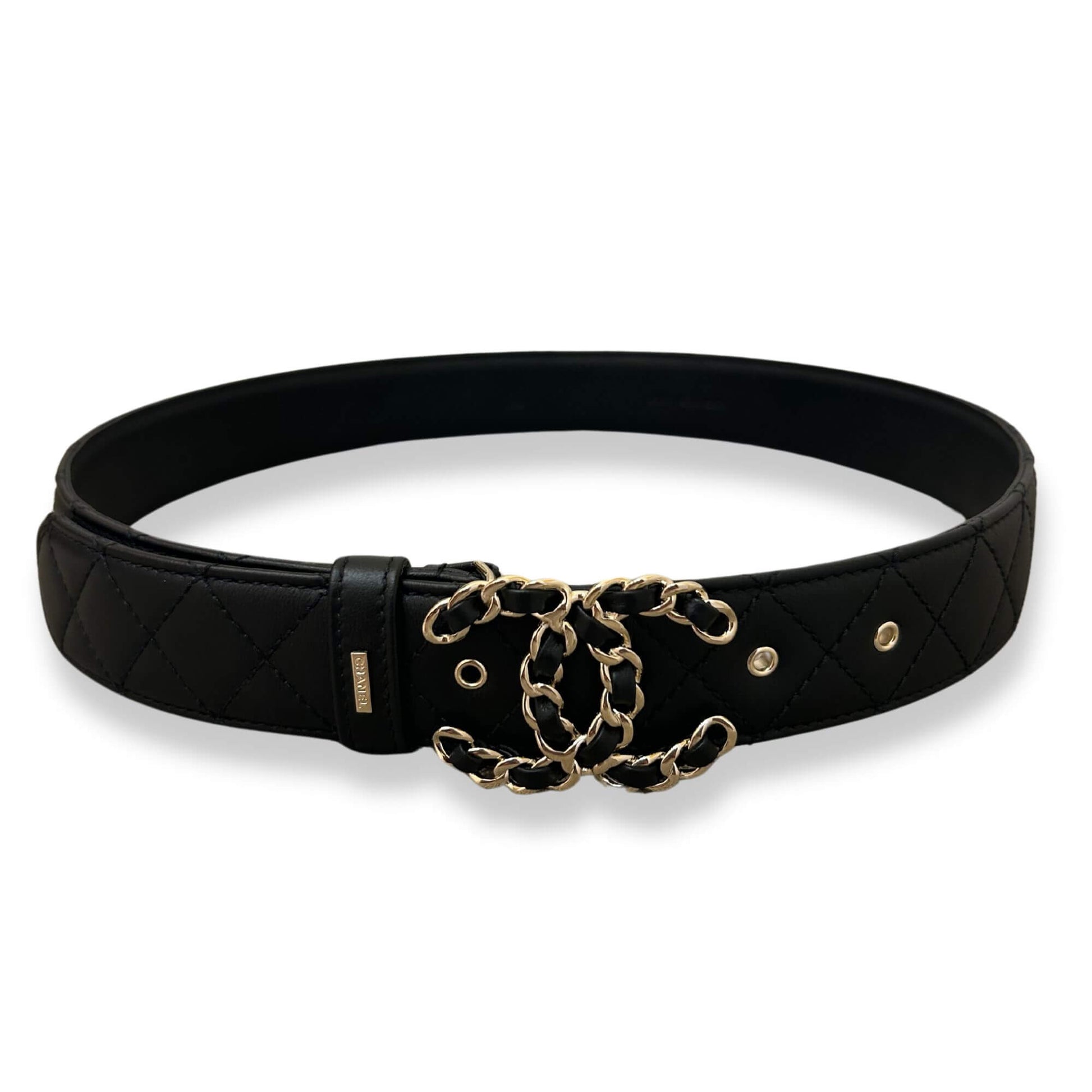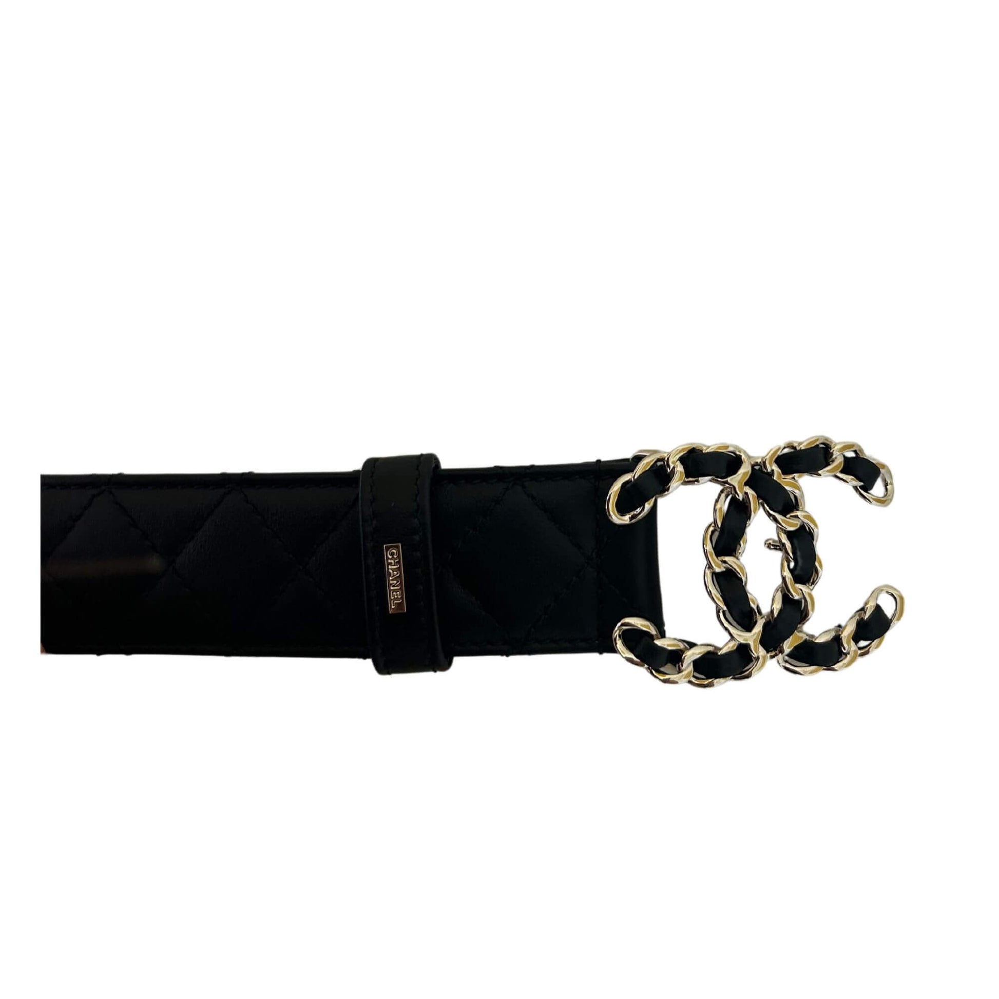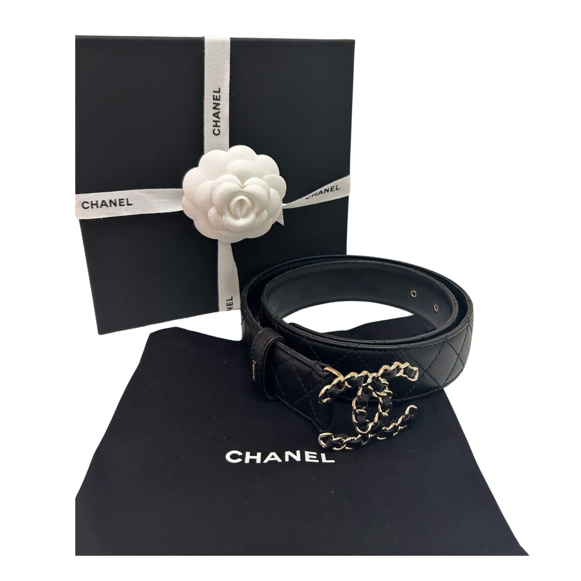 This NEW Chanel belt is made out of black leather and has the iconic ''CC'' logo in the front combining leather with a golden colored metal chain.