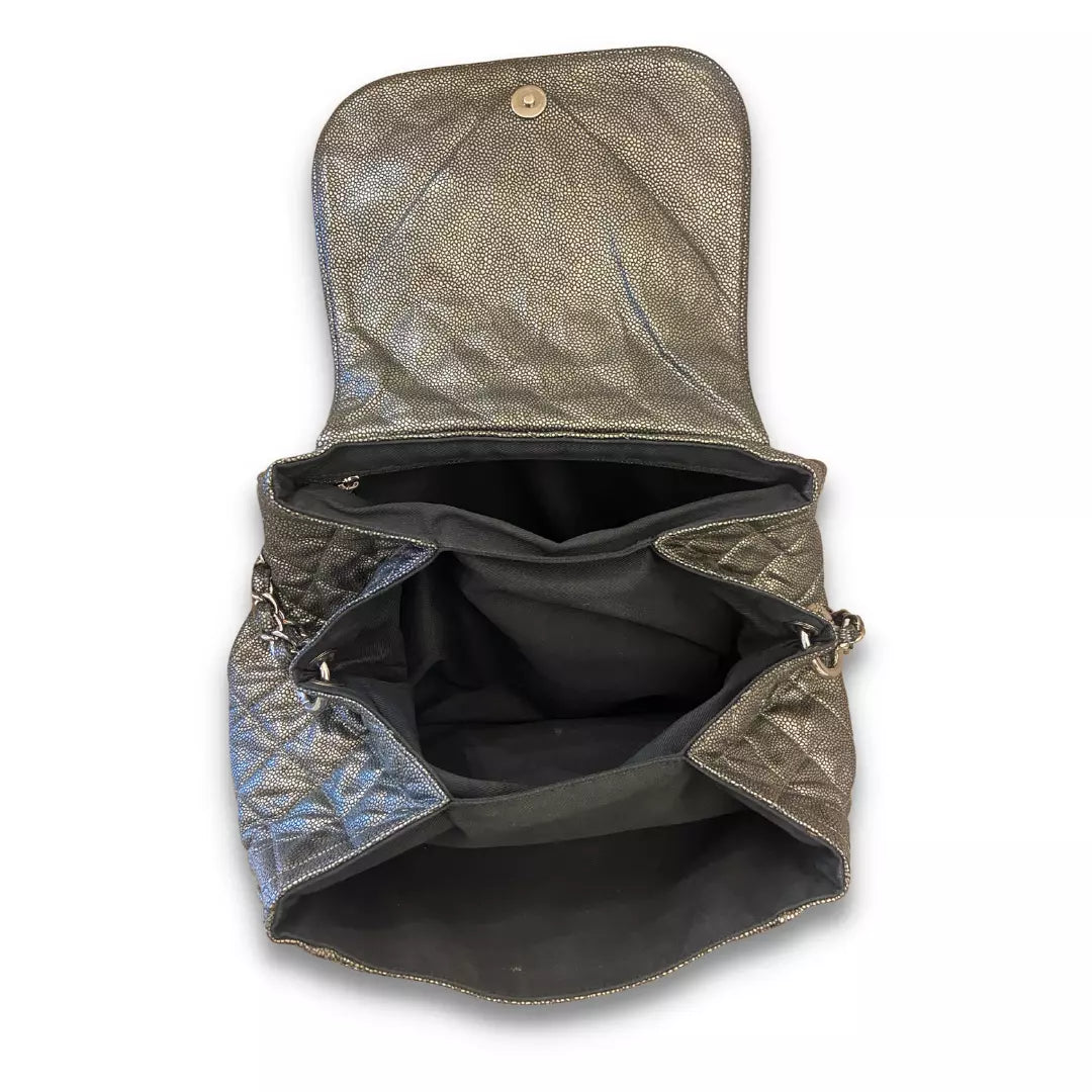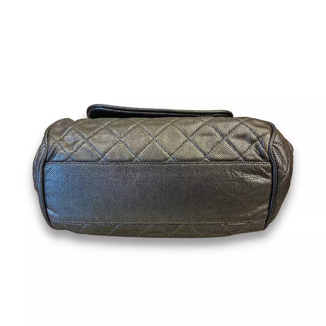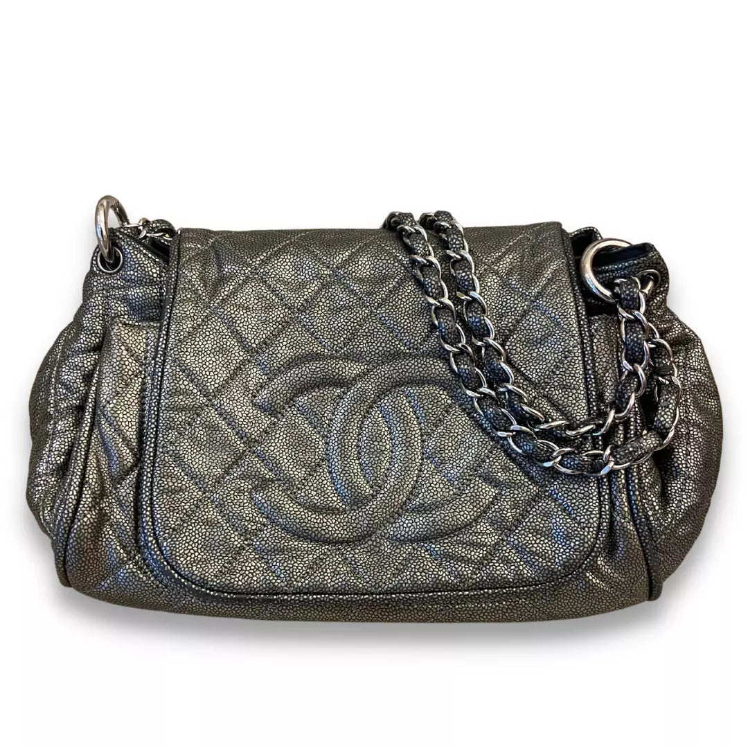 Pre-loved Chanel Bag in Black Metallic Leather with flap. It has three large interior accordion pockets. It is a 2011 model in very good condition.