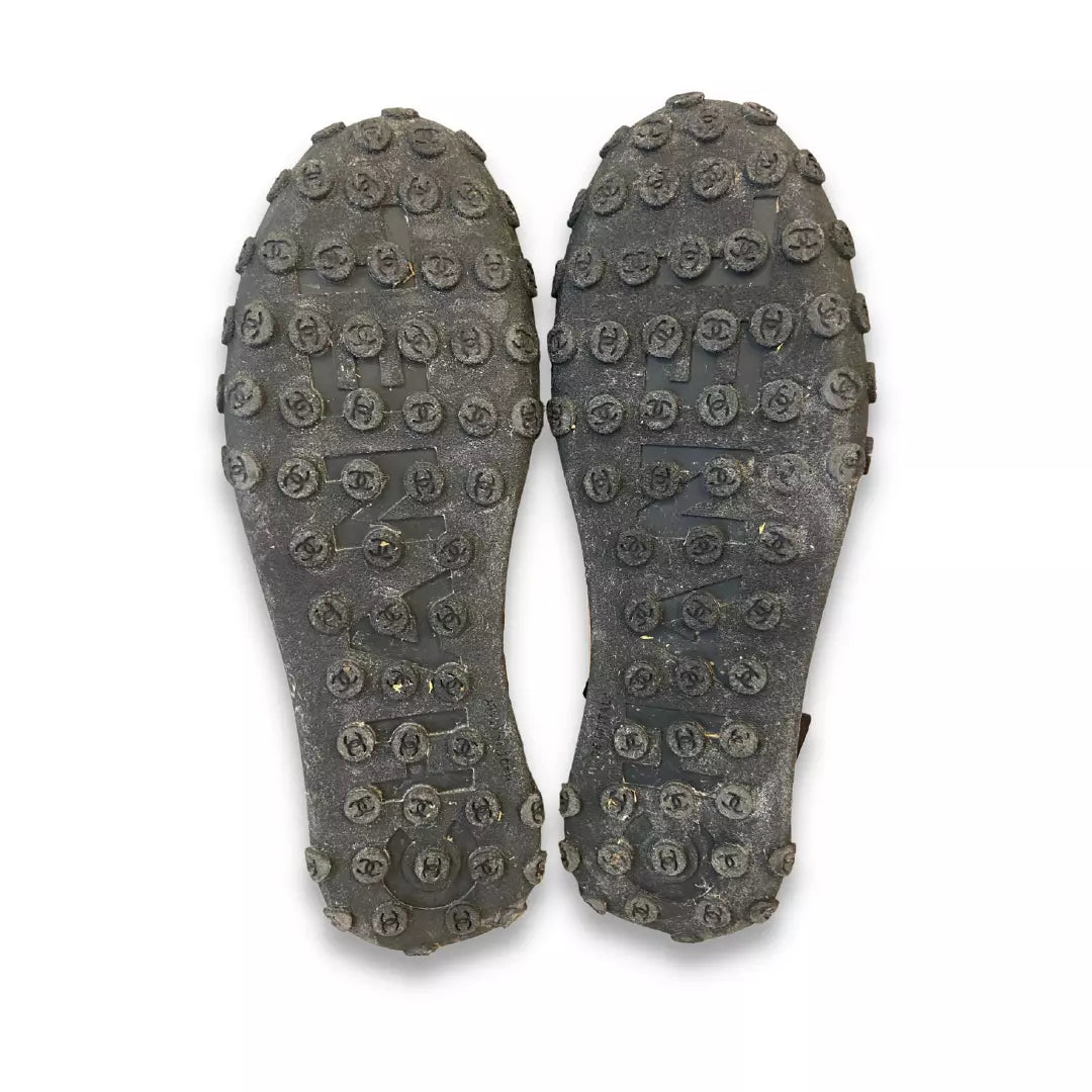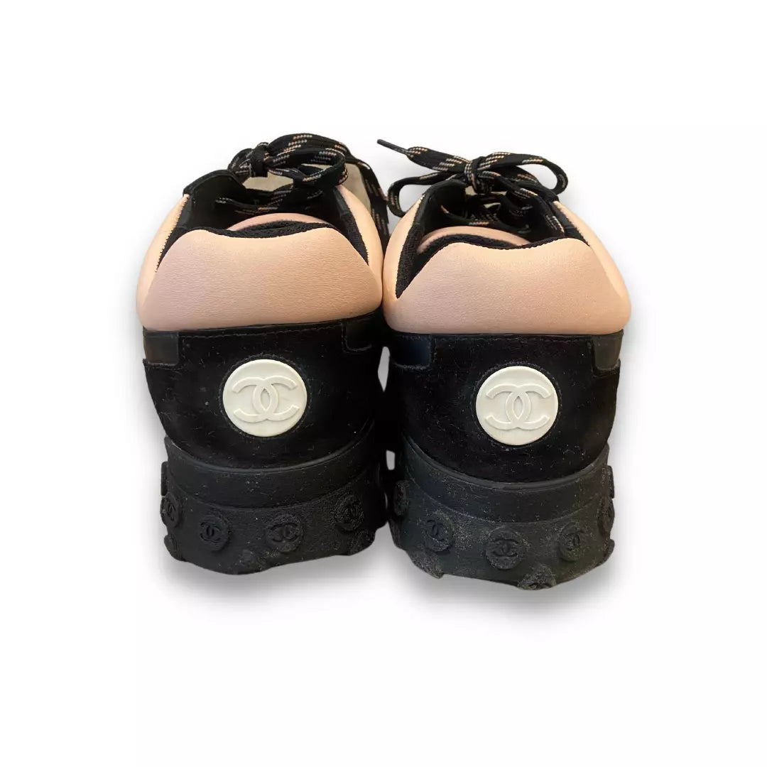 These Pre-loved Chanel Pink Suede Calfskin & Nylon CC Sneakers, with nude suede calfskin, matching black rubber sole, black CC Chanel logo on the side and black leather and pink nylon details are in Very Good condition.