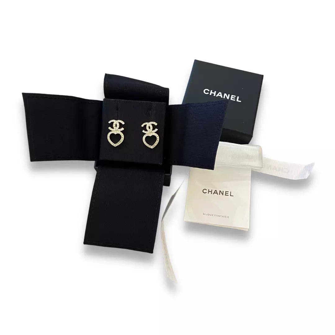 New Chanel CC Heart Crystals & Metal Earrings, with CC Chanel iconic logo, heart metal and stud closure.