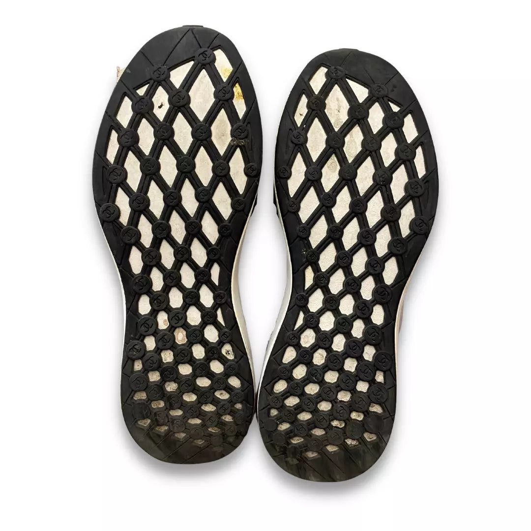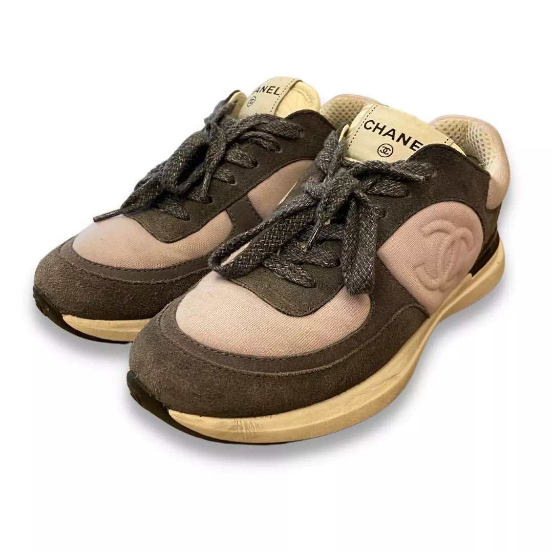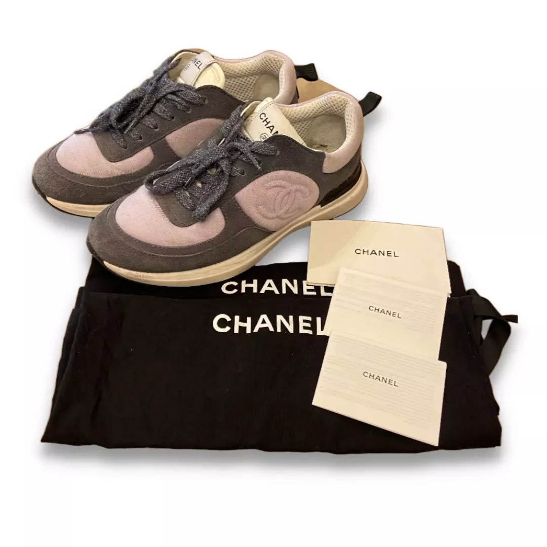 These Pre-loved Chanel Pink Suede Calfskin CC Sneakers Shoes, with grey suede calfskin, matching white rubber sole, nylon purple CC Chanel logo on the side and grey leather and nylon details are in Very Good condition.