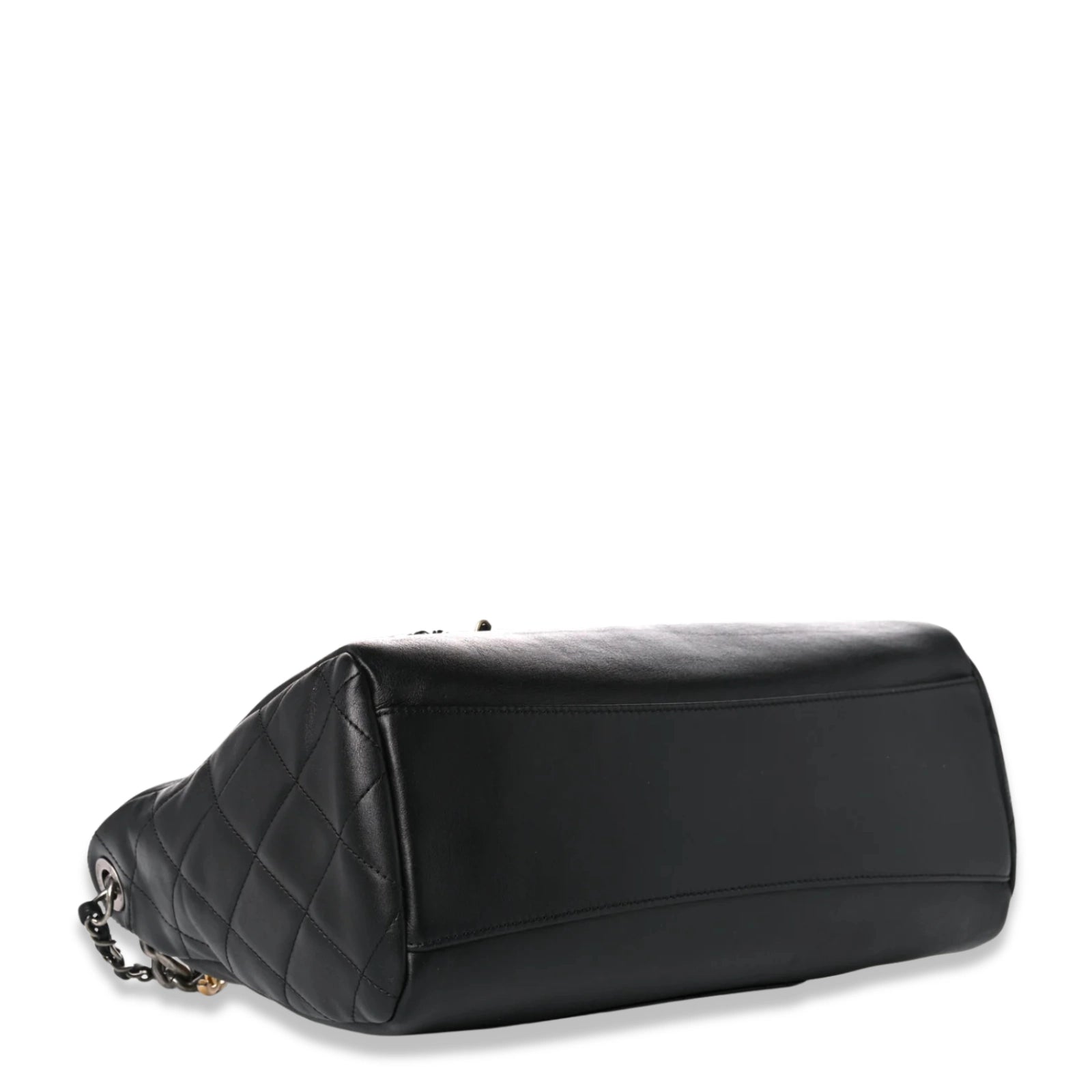 This bowling bag from Chanel in Calfskin Chain 20s Signature Hobo in Black. This chic shoulder bag is crafted of smooth calfskin leather in black with diamond quilted side panels and rear pocket.