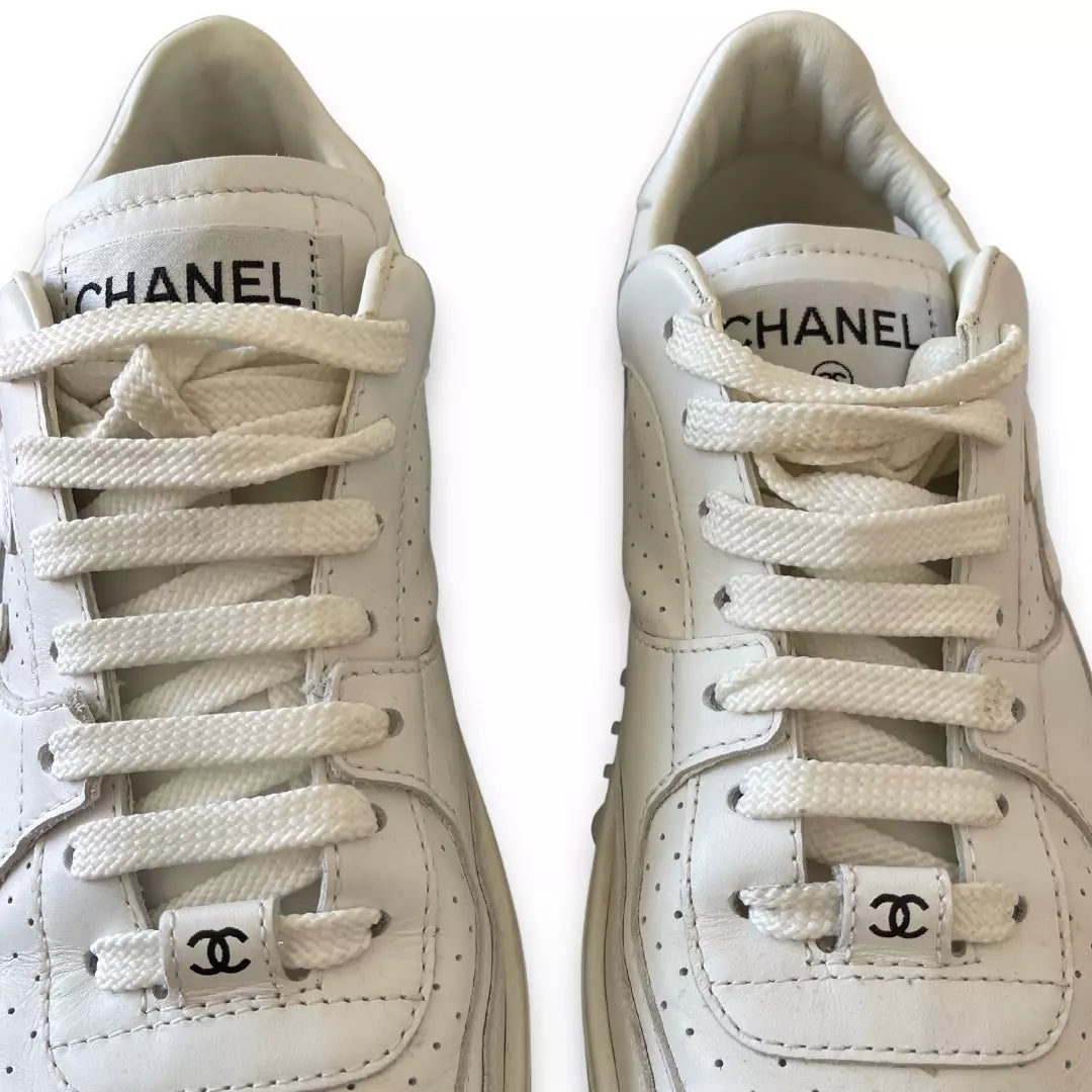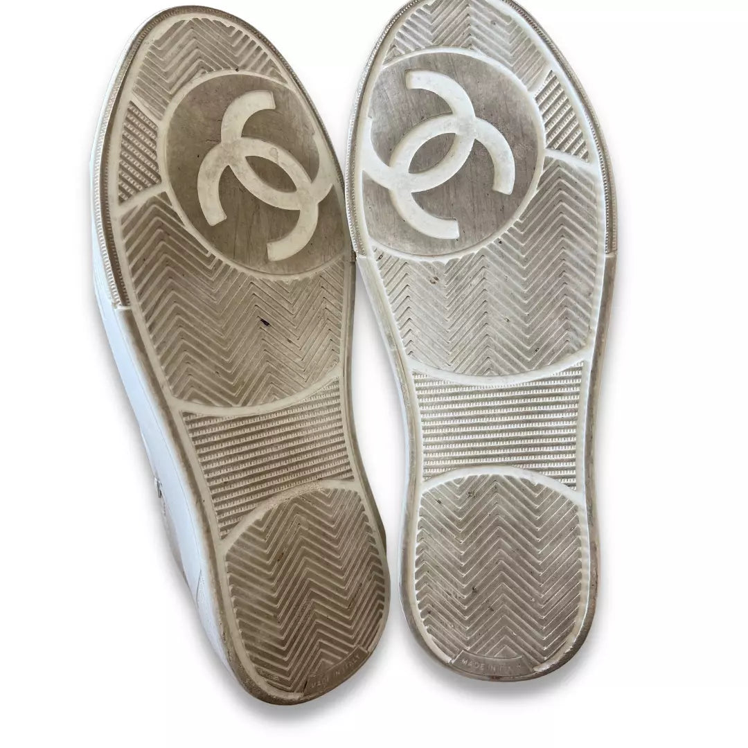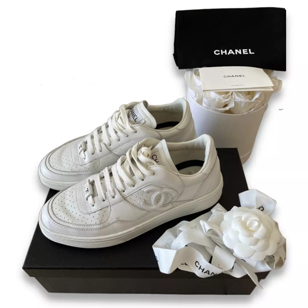 These Pre-loved Chanel White Leather CC Sneakers Shoes, with white leather, matching white rubber sole and white leather calfskin CC Chanel logo on the side are from 2023 collection. Sold out everywhere. These are in very good condition used one day.
