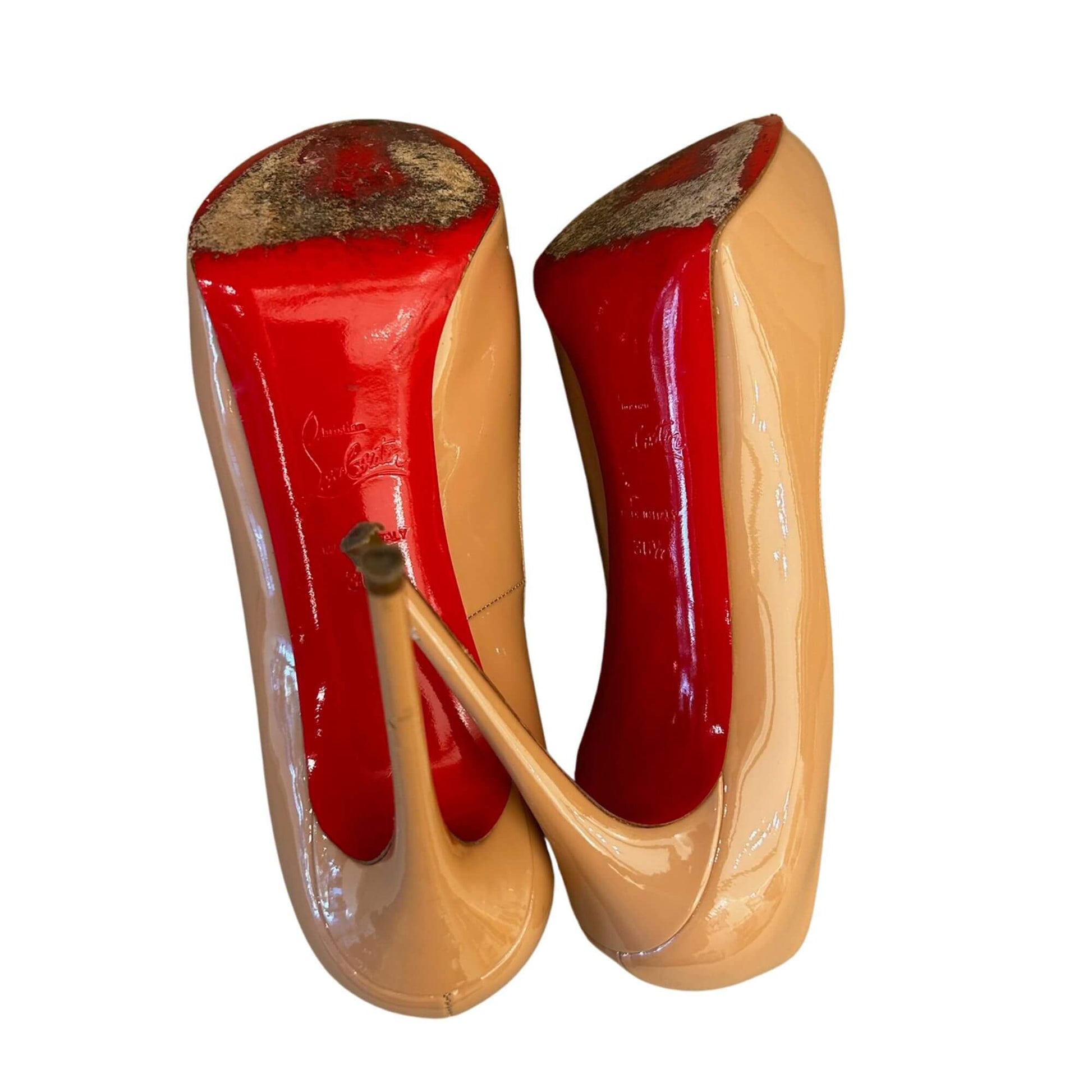 These PRE-LOVED Christian Louboutin glossy beige blue patent leather very privé pups are an iconic piece of the brand. Lined with the brands signature red.