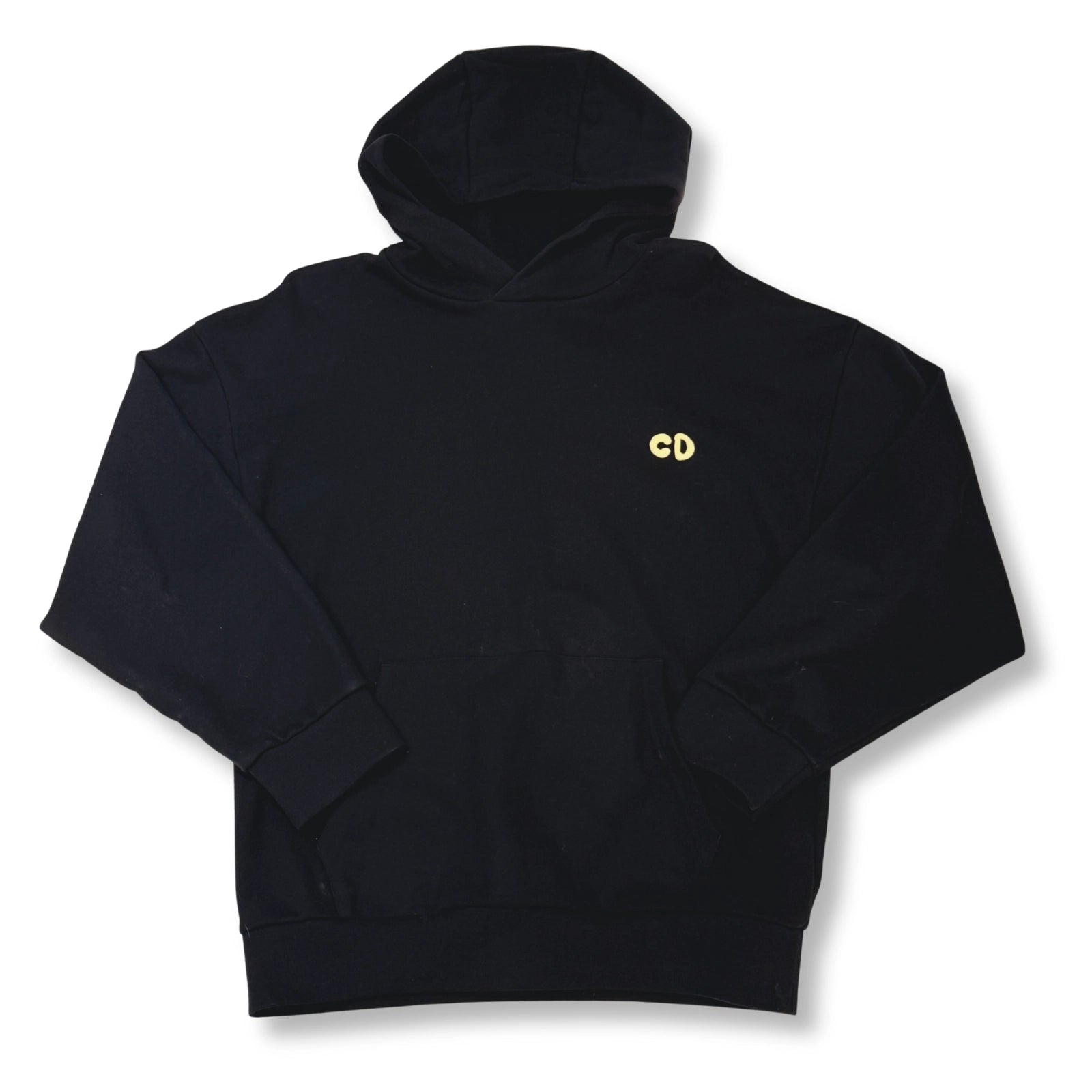Black Dior cotton hoodie with relaxed, oversized fit and small pale yellow “CD” logo on the chest. A minimalist and versatile piece designed for everyday luxury wear.