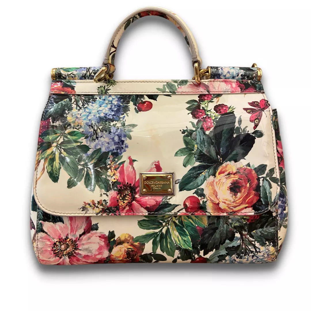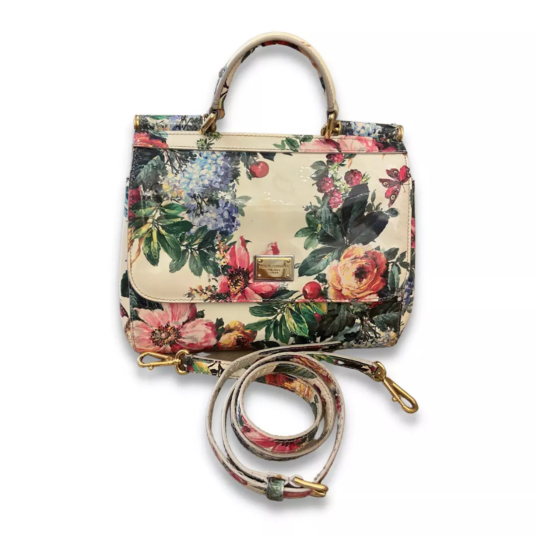 This Pre-loved Dolce & Gabbana Flowers Patent Leather Sicily Hand Bag, with golden hardware is in Very Good condition, this have a little deformation on the patente leather. It comes with a long cross-body removable chain.