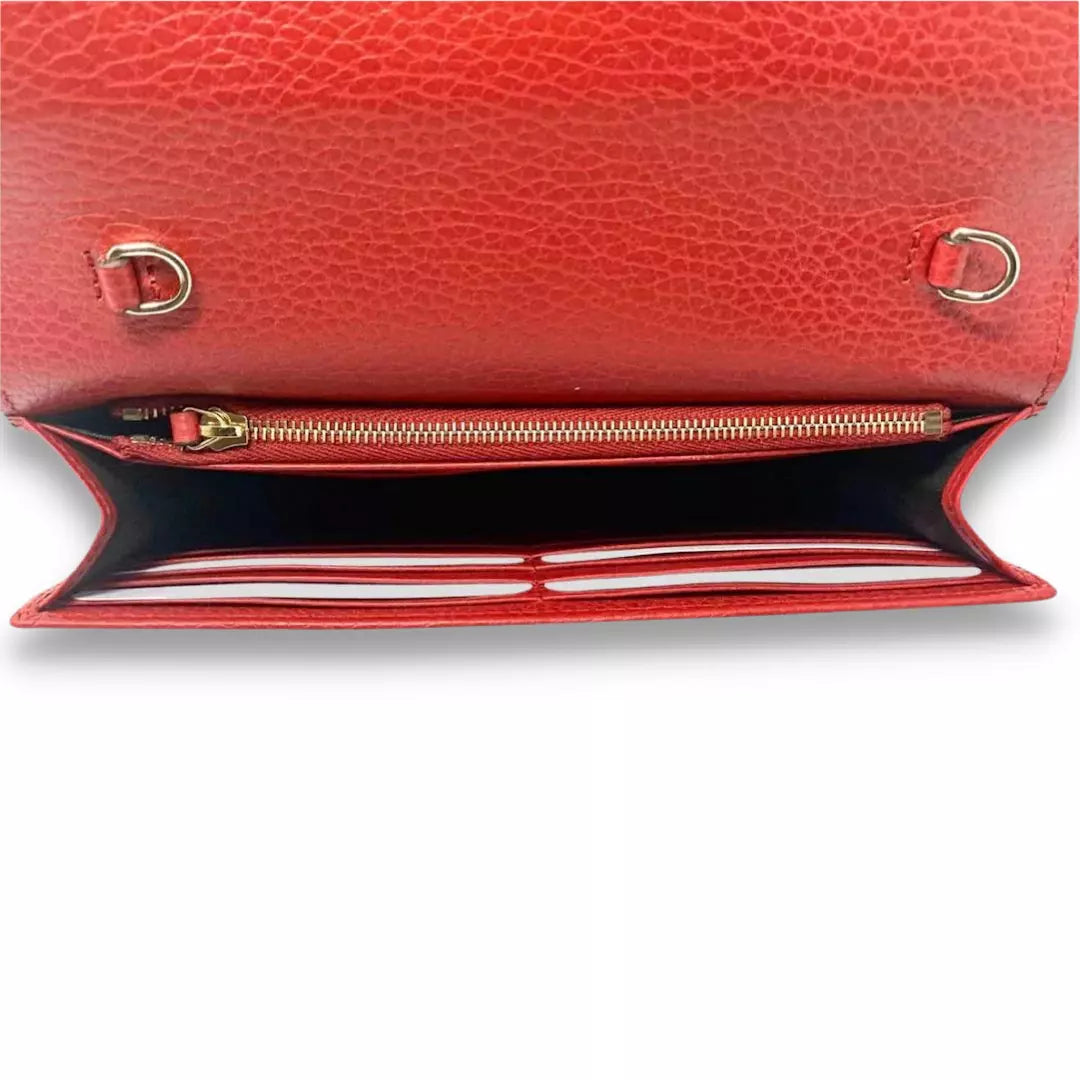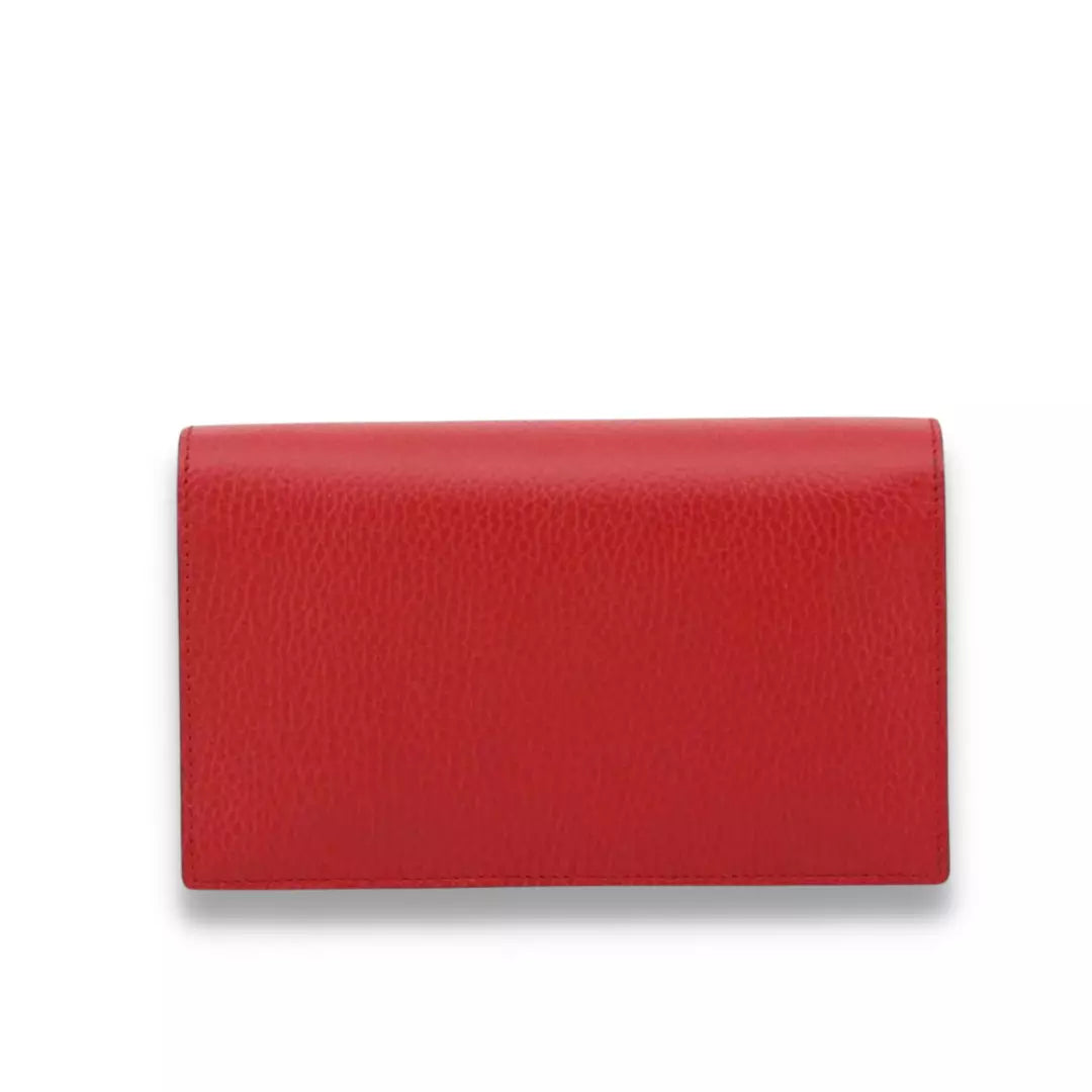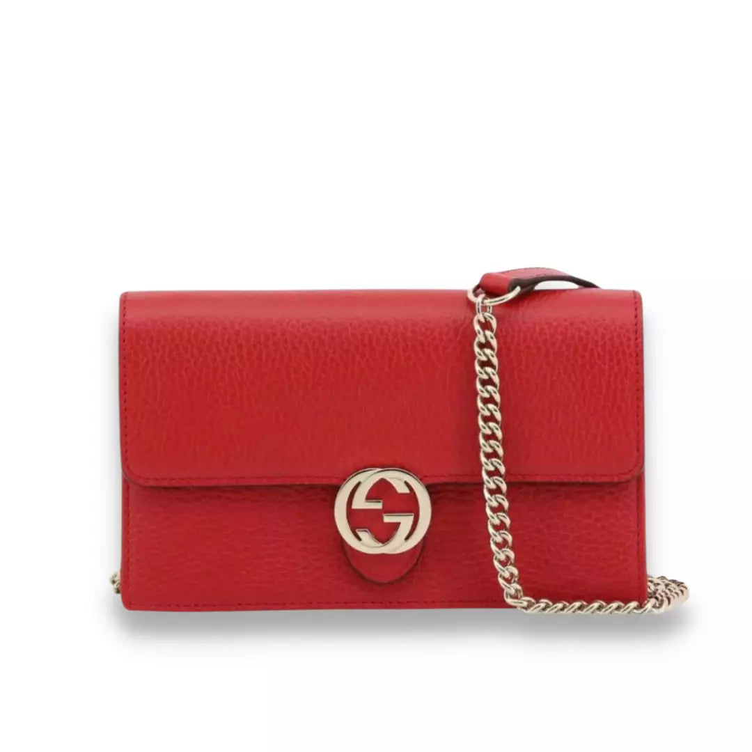 Completely new Gucci Red Leather Interlocking WOC Shoulder Bag. The bag is made in grained calfskin and features and interlocking "G", the inside is divided in practical compartments perfect for carrying essentials.