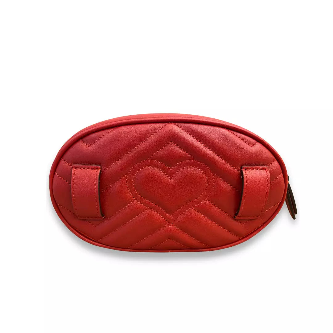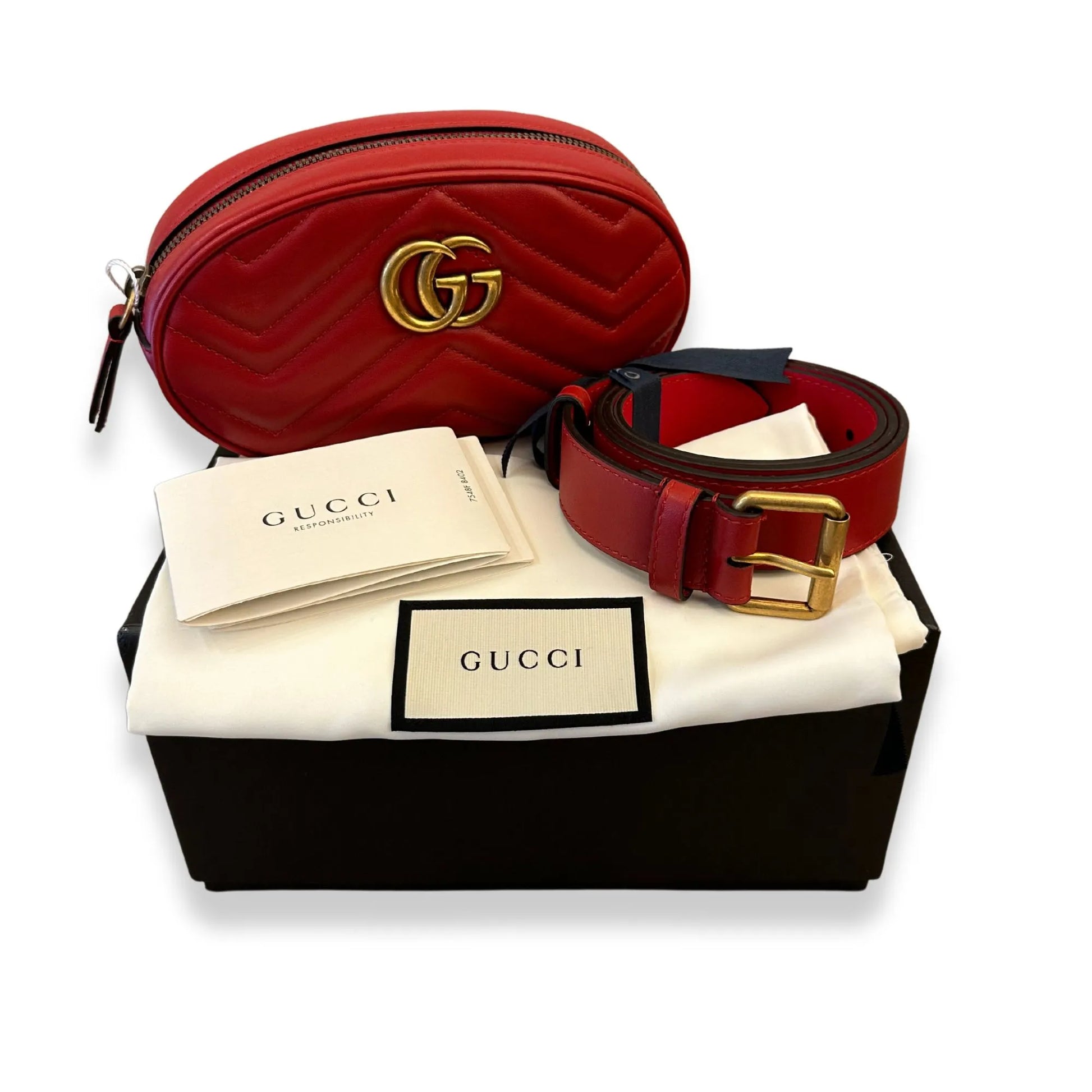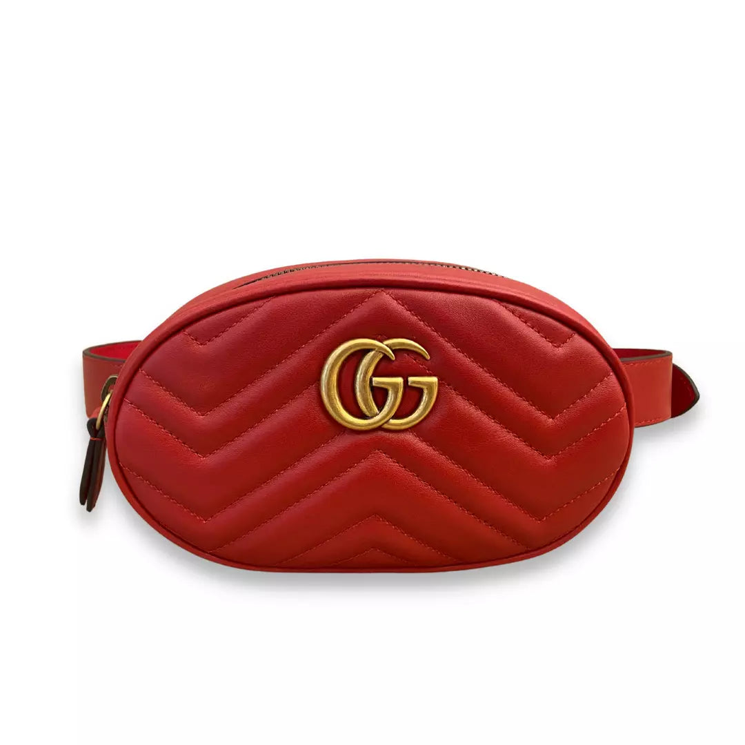 Completely new GG Gucci Red Matelassé Leather GG Marmont Belt Bag. It is made in matelassé chevron leather and and finished with aged gold toned hardware. The bag comes with an adjustable 85 cm belt. It is in Pristine Condition as it has never been used.