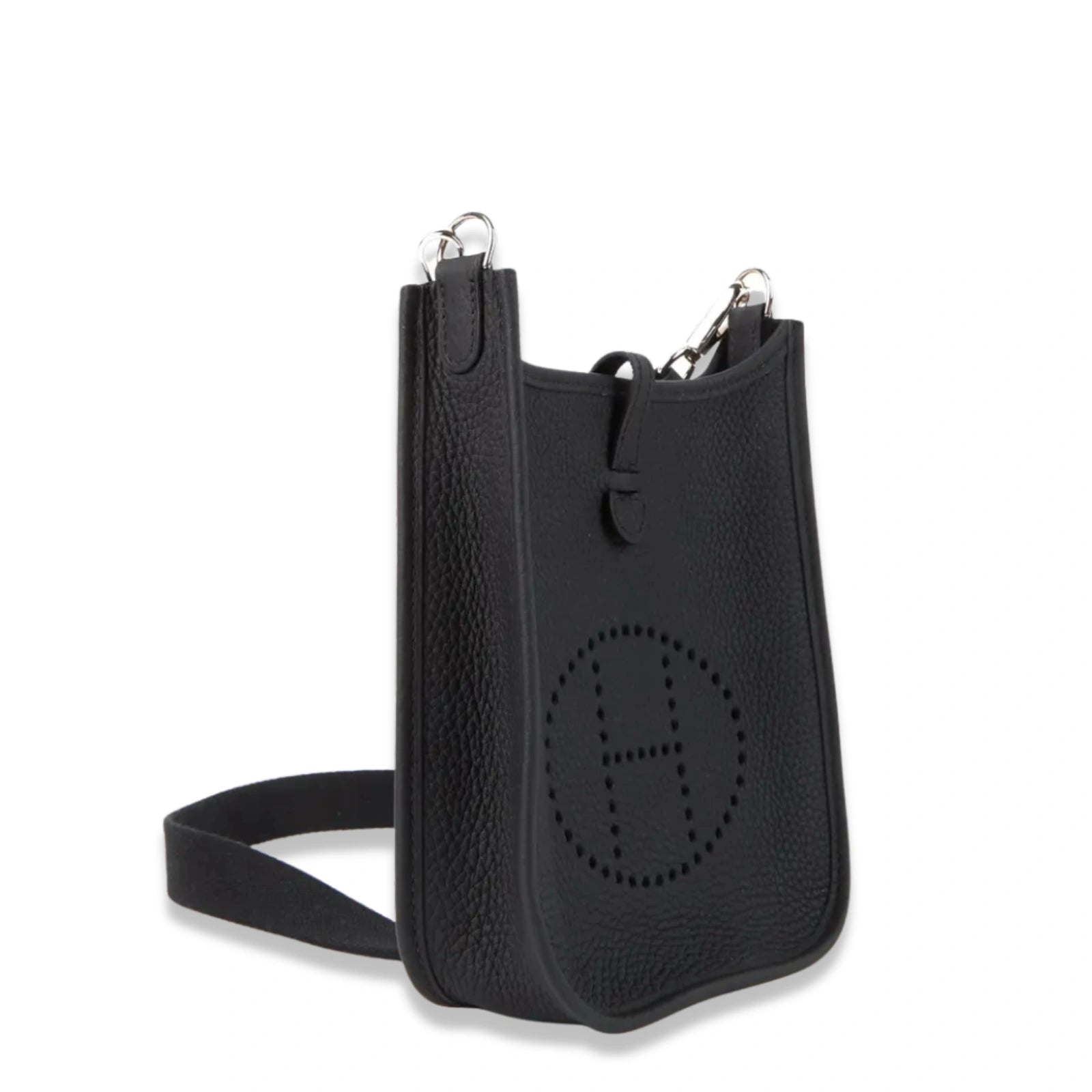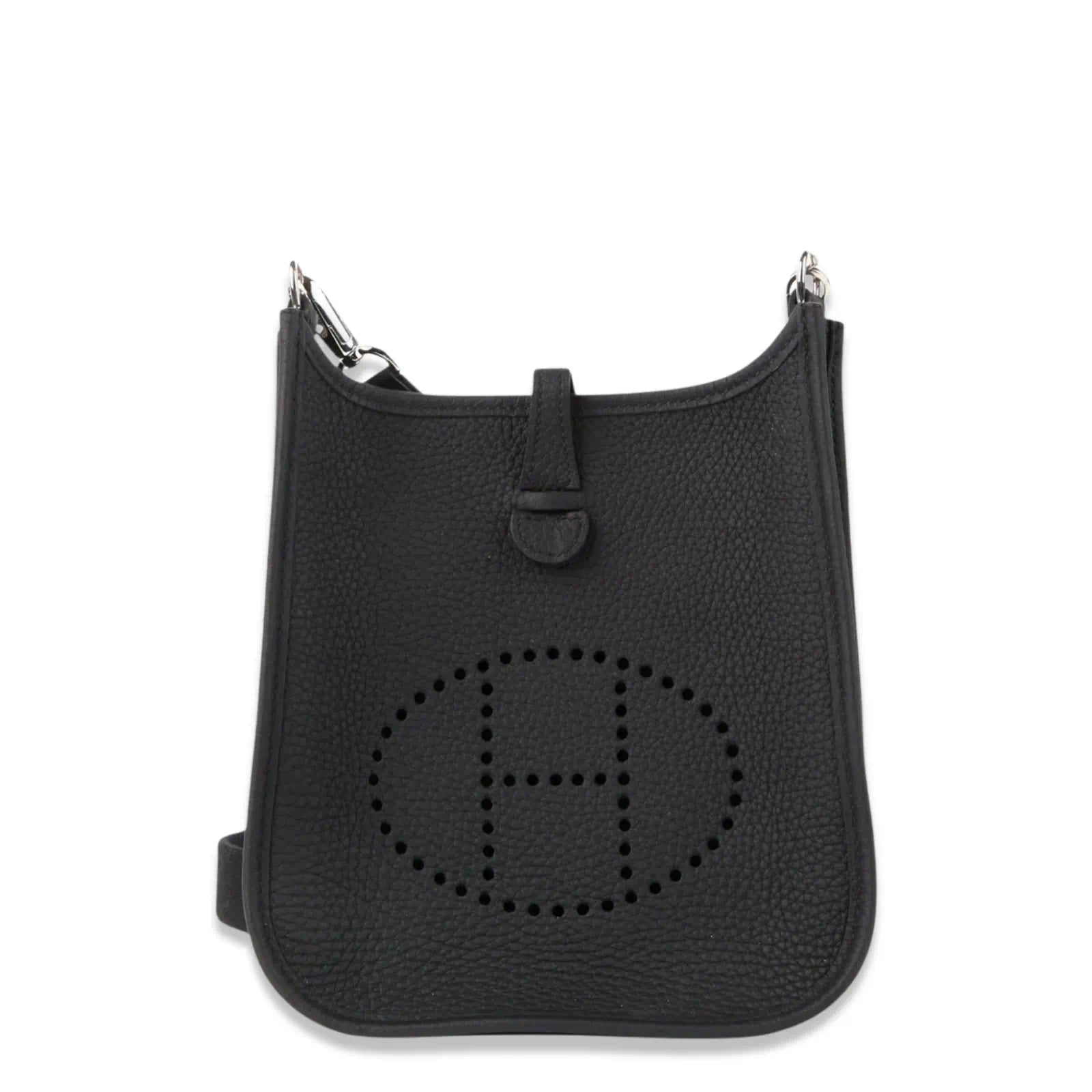 Hermès Evelyne 16 Black crossbody bag in Leather with a grey wool sangle strap, perforated leather "H", leather tab closure and palladium hardware.